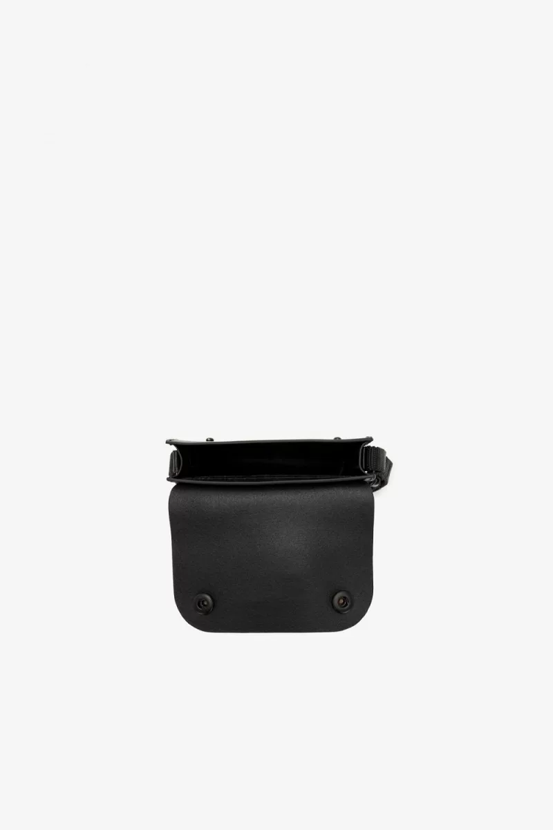 Burnished leather / Crossbody pouch shape / One main pocket / Webbing strap / Branded popper closure