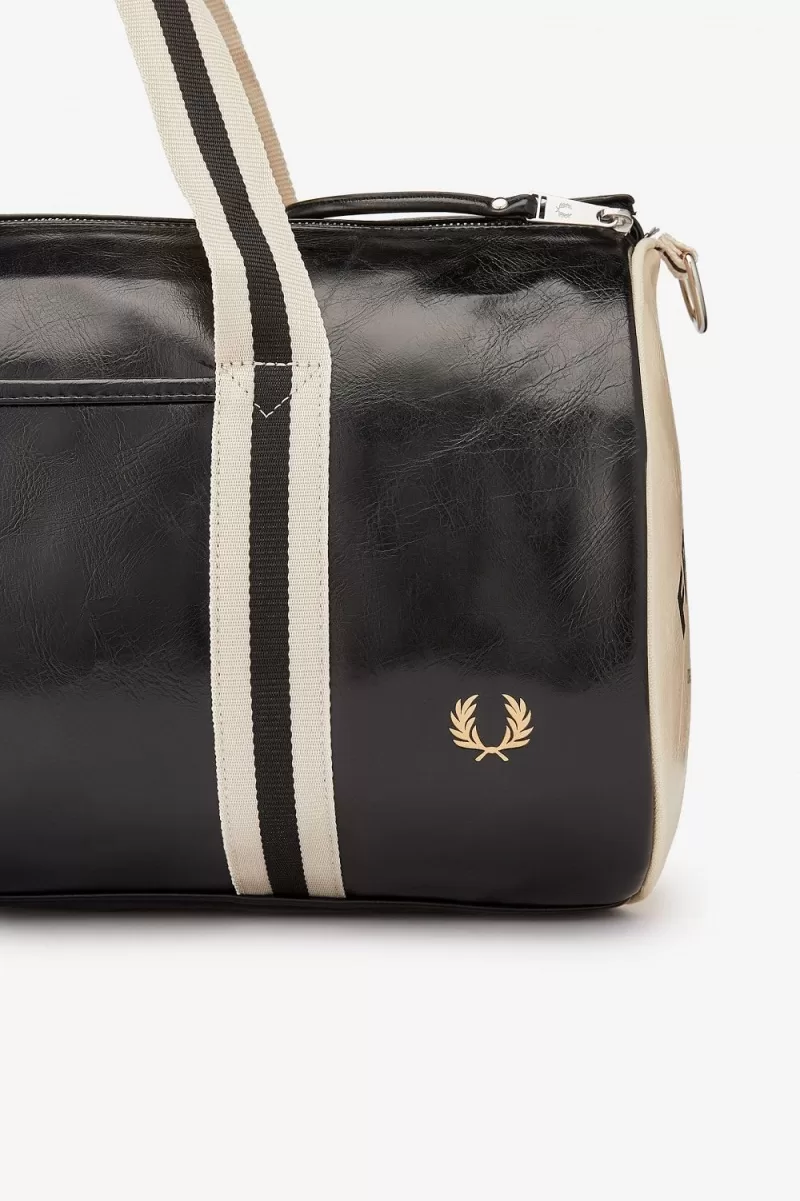 The classic Fred Perry barrel bag – designed in a range of colourways in durable PU. Featuring all its original details, with strong webbing handles and a zipped compartment at one end.