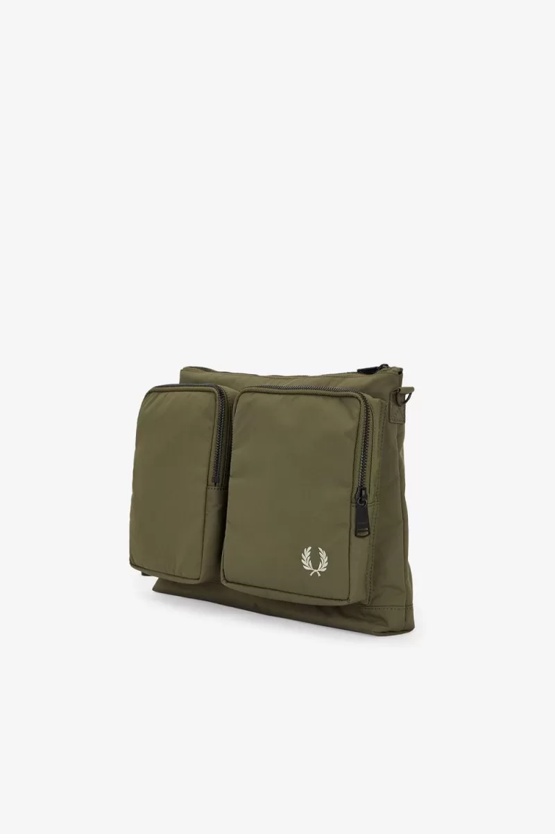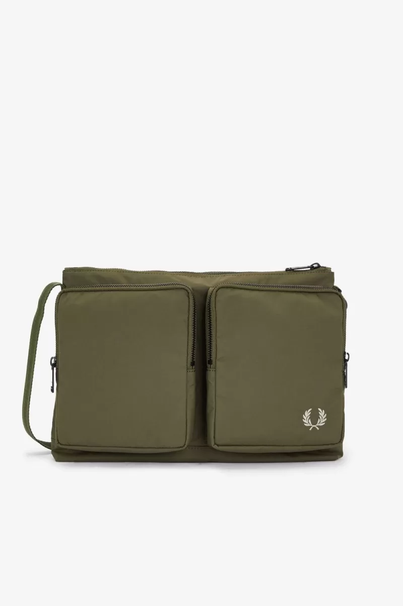 Recycled nylon fabric / Adjustable strap with tonal tipping / Matt black hardware / Two large front zip pockets and internal pocket / Gold foil Laurel Wreath logo to front right pocket