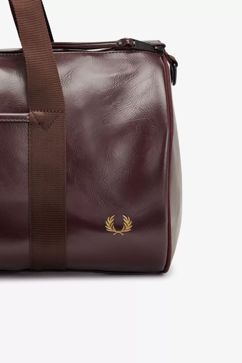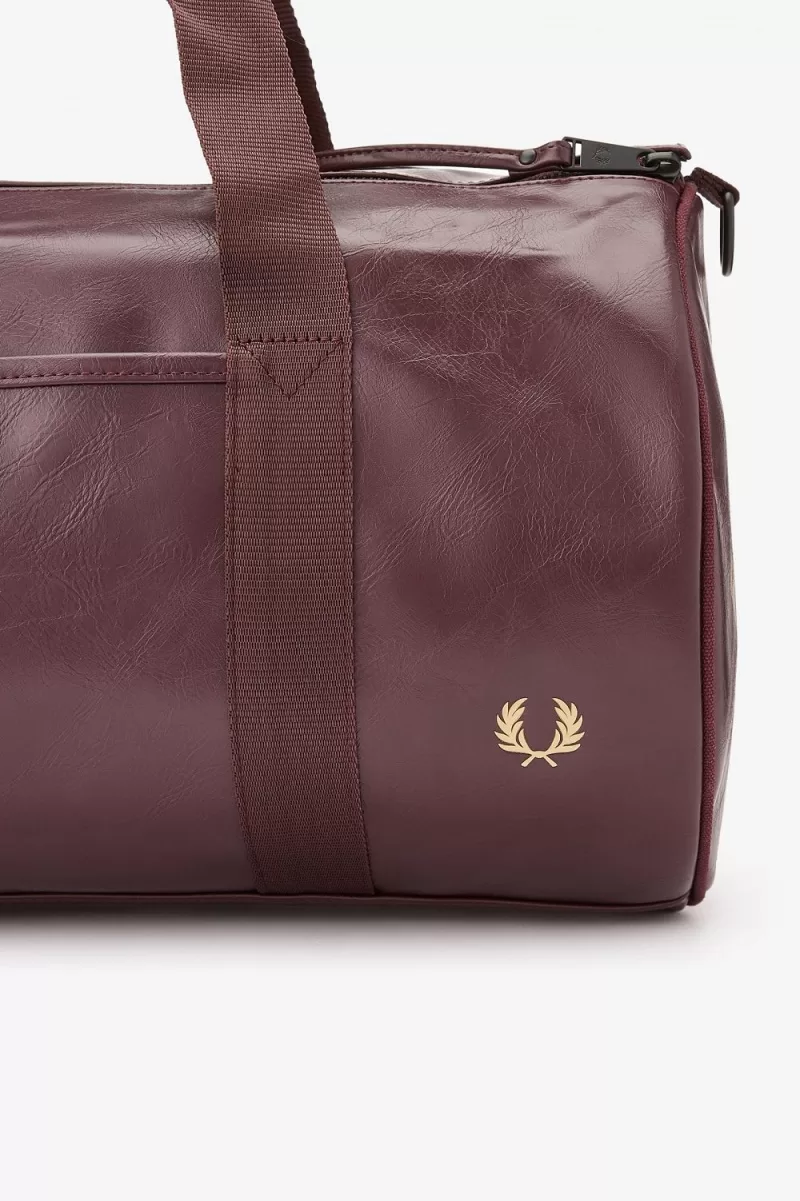 The classic Fred Perry barrel bag in durable PU, designed with tonal detailing. Fitted with strong webbing handles, a zipped compartment at one end and signature arch branding.