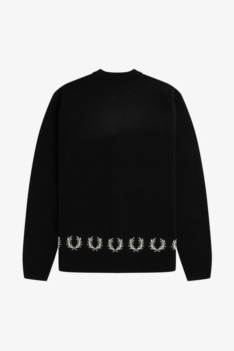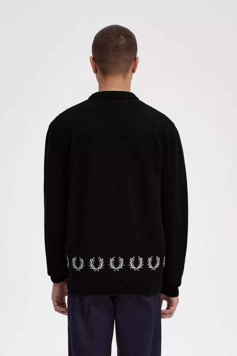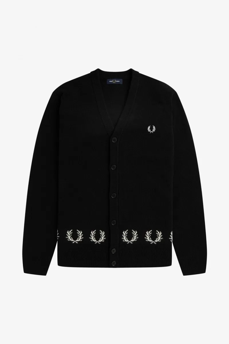 Our pure lambswool knit cardigan with Fair Isle Laurel Wreath trims to the hem, inspired by an early sponsor of Fred known as the ‘matador on skis’.