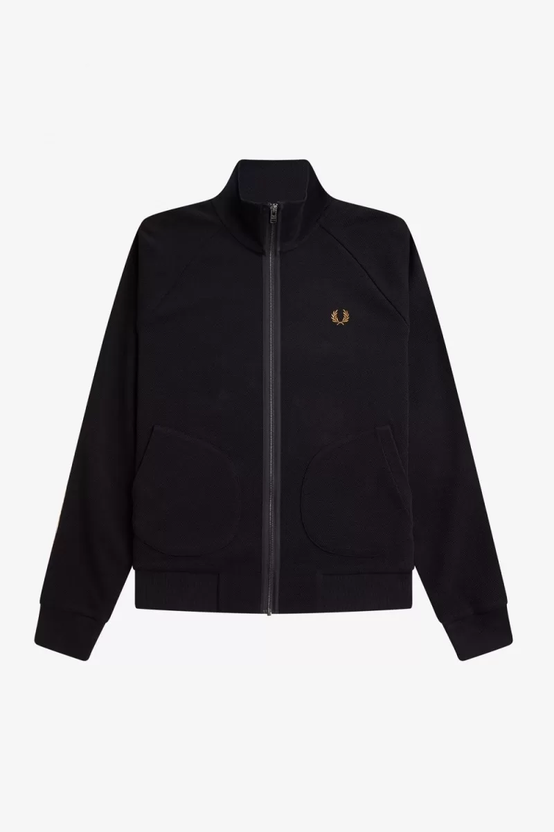 The chequerboard motif is a key design inspiration – a long held Fred Perry theme playing on the sporting grids of tennis nets and the digital squares of nightclub video graphics. Sports meet subculture on the chequerboard tape jacket, with all the familiar detailing, and our classic track taping keeping things on brand.