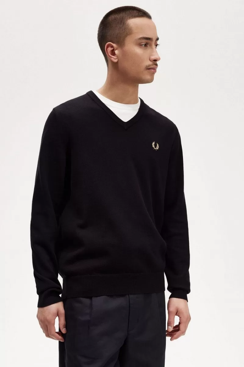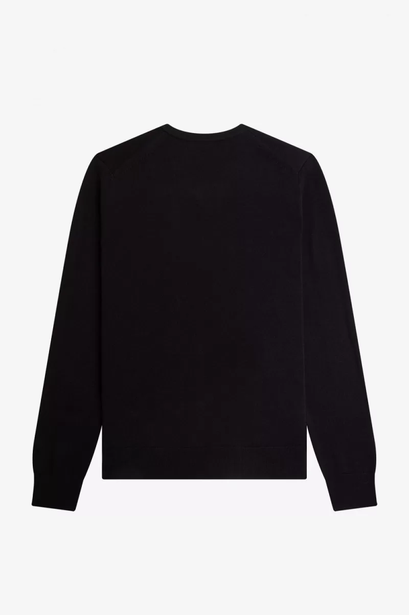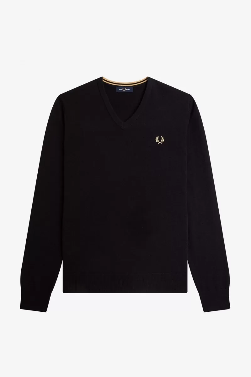 A V-neck jumper with a merino wool blend and our signature twin twipping at the neck.