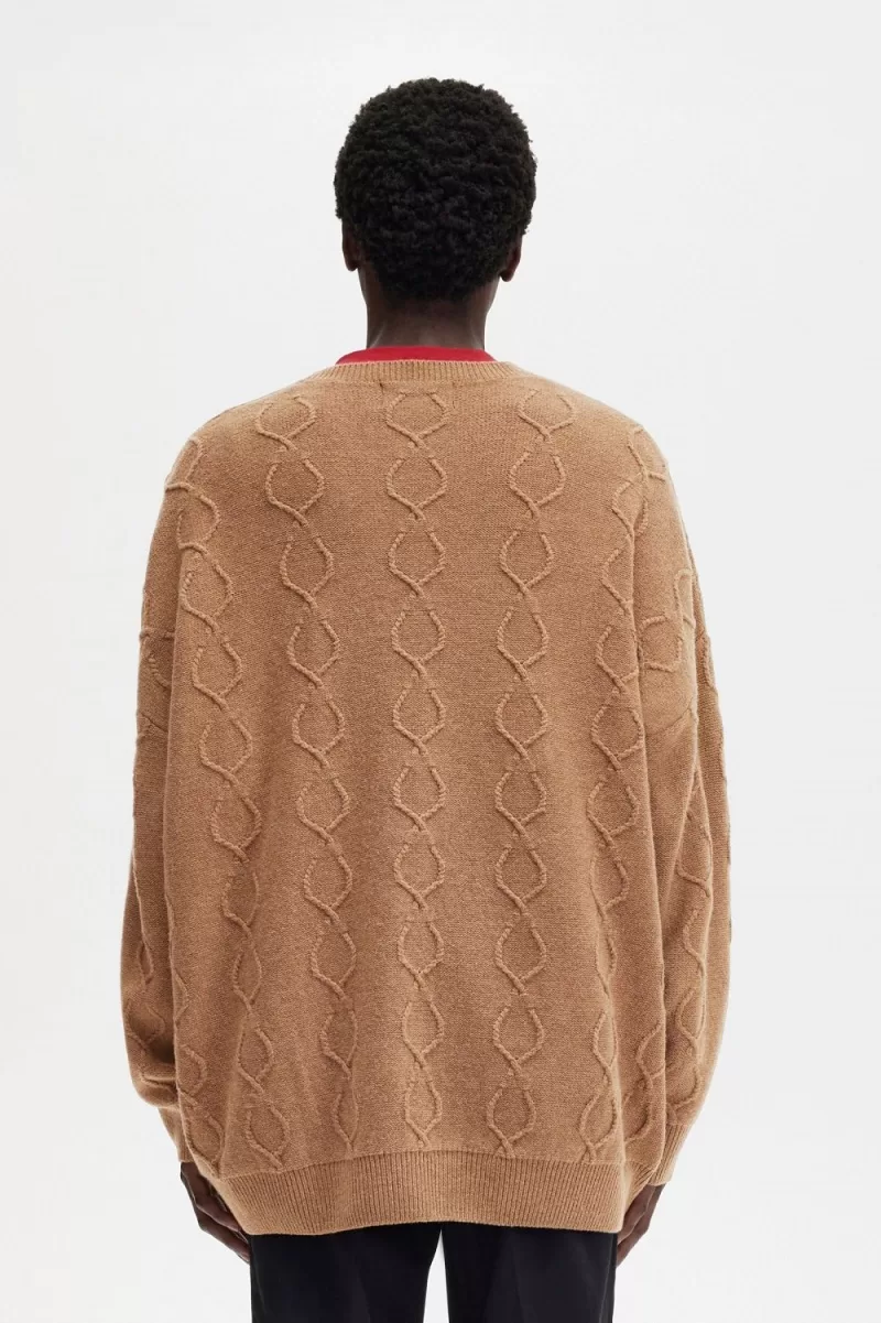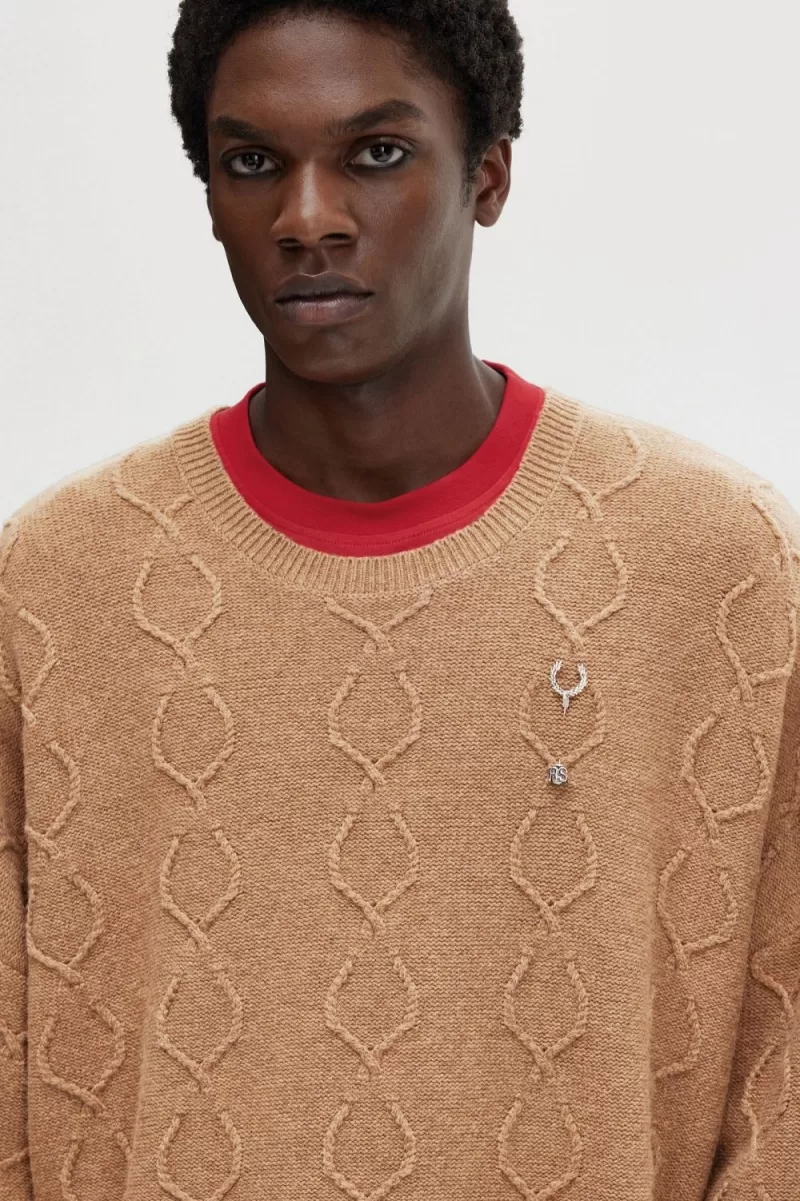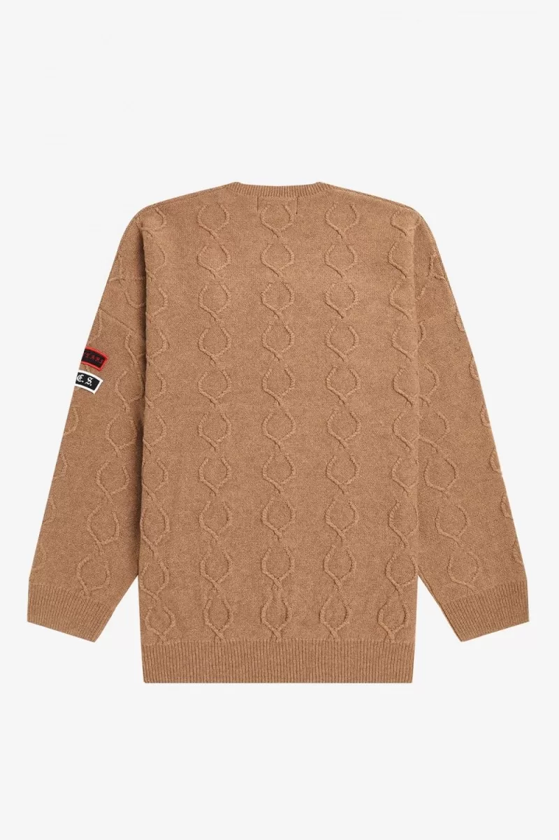 Raf Simons reinterprets familiar Fred Perry silhouettes with the sensibilities of his eponymous line and influenced by the clothes worn at raves, club nights and gigs. Inspired by his fascination with utilitarian uniforms and graphics taken from fictional early industrial records of the late ‘70s, our latest Raf Simons collection is as at home on the floor of a techno rave as it is at a packed band show. Our textured knit oversized jumper is crafted from an ethically-sourced merino wool and features custom patches to the body and left sleeve and a Raf Simons branded pin to the left chest. A reimagined classic, that combines conventional style with a rebellious spirit. To wear the Fred Perry x Raf Simons collection is to feel part of something – the power of youth and belonging.