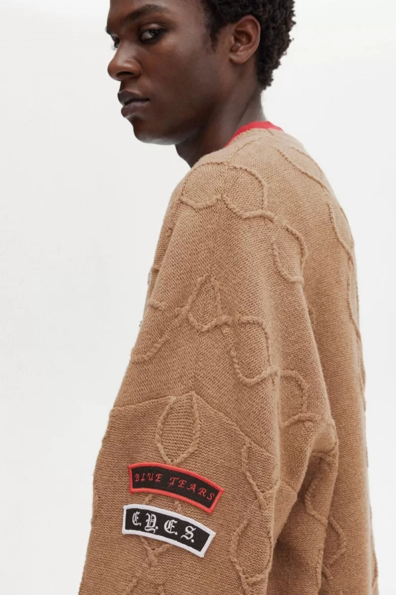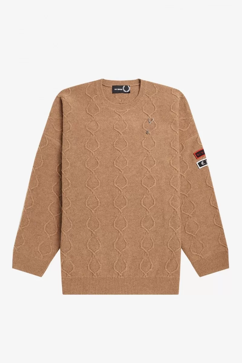 We collaborate with Raf Simons on a textured knit, oversized jumper featuring custom graphic patches.
