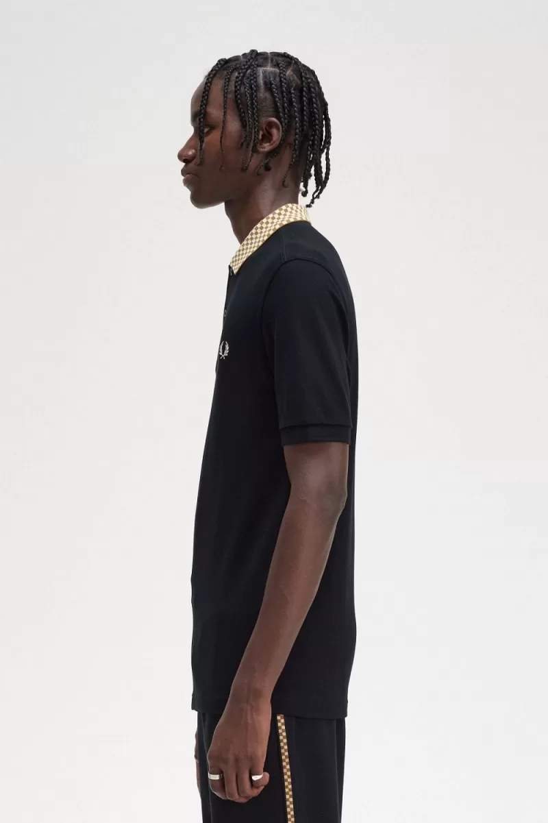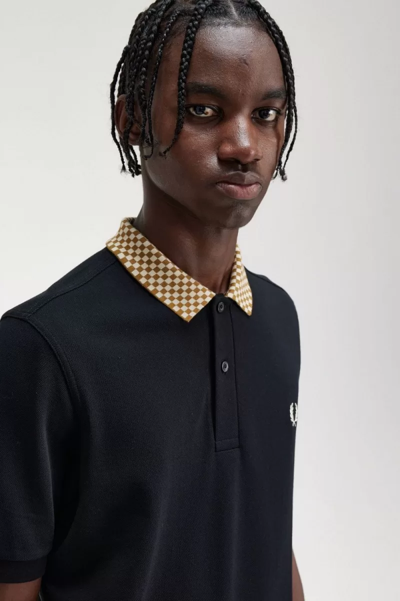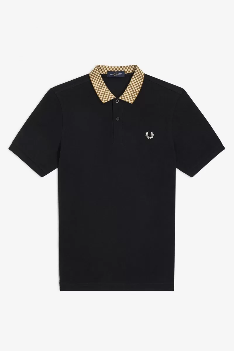 Classic cotton piqué fabric / Classic fit / Chequerboard flat knit jacquard collar / Fred Perry branded buttons / Laurel Wreath embroidered logo on the left hand chest