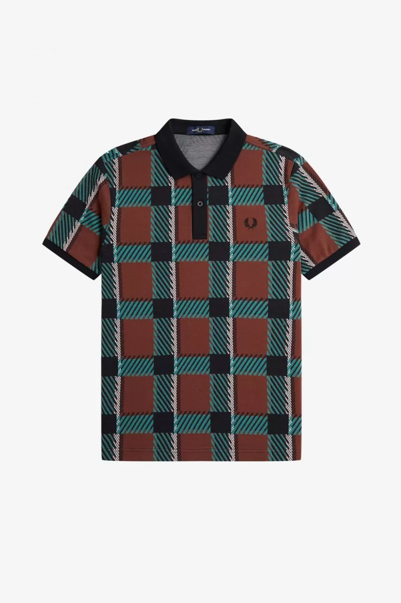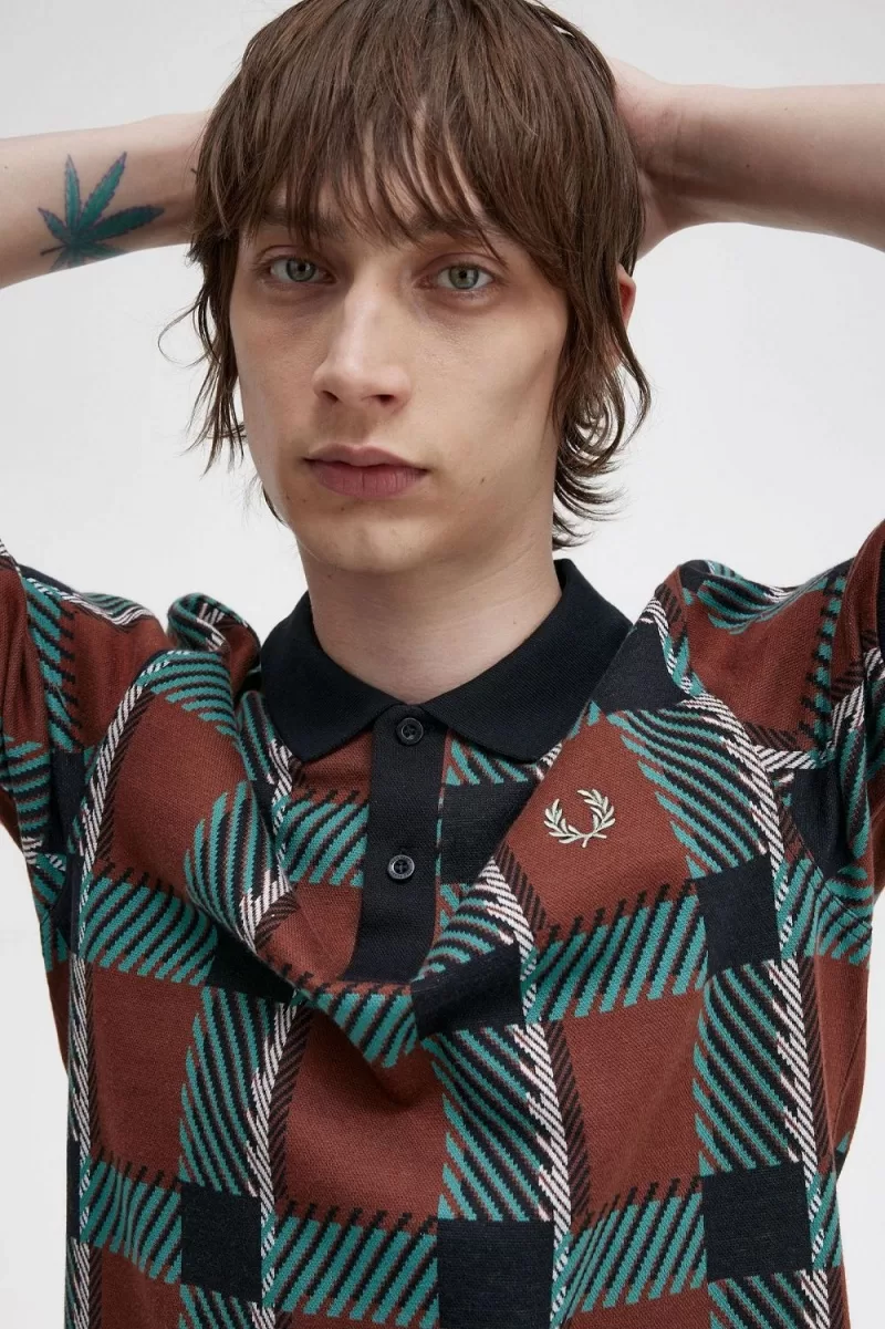 Our glitch tartan polo shirt is inspired by the loud, textured mohair knits of the 1970s, and the traditional tartan first woven by the Scots and then fondly adopted by punks. Finished with a black two-button box placket in sharp relief, and the embroidered Laurel Wreath in pride of place on the left hand chest.