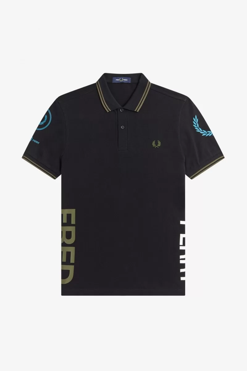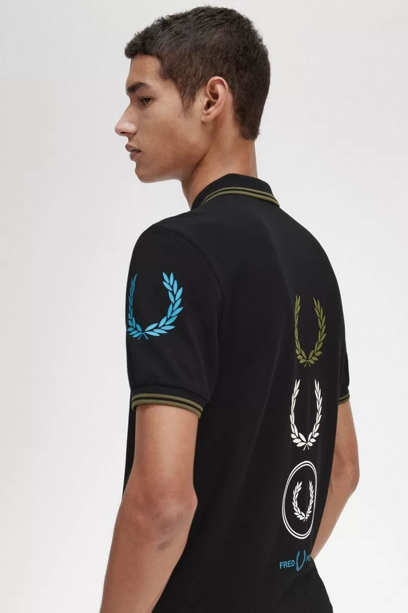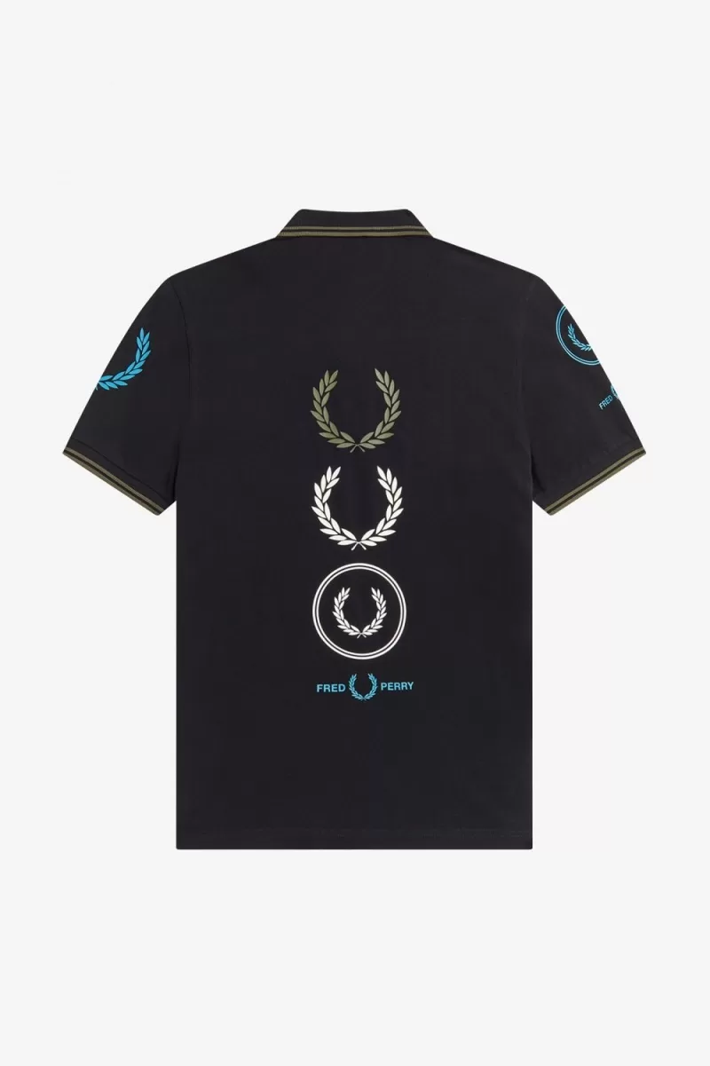 Classic cotton piqué fabric / Classic fit / Box placket / Front and rear multi graphic print / Laurel Wreath embroidered logo on the left hand chest