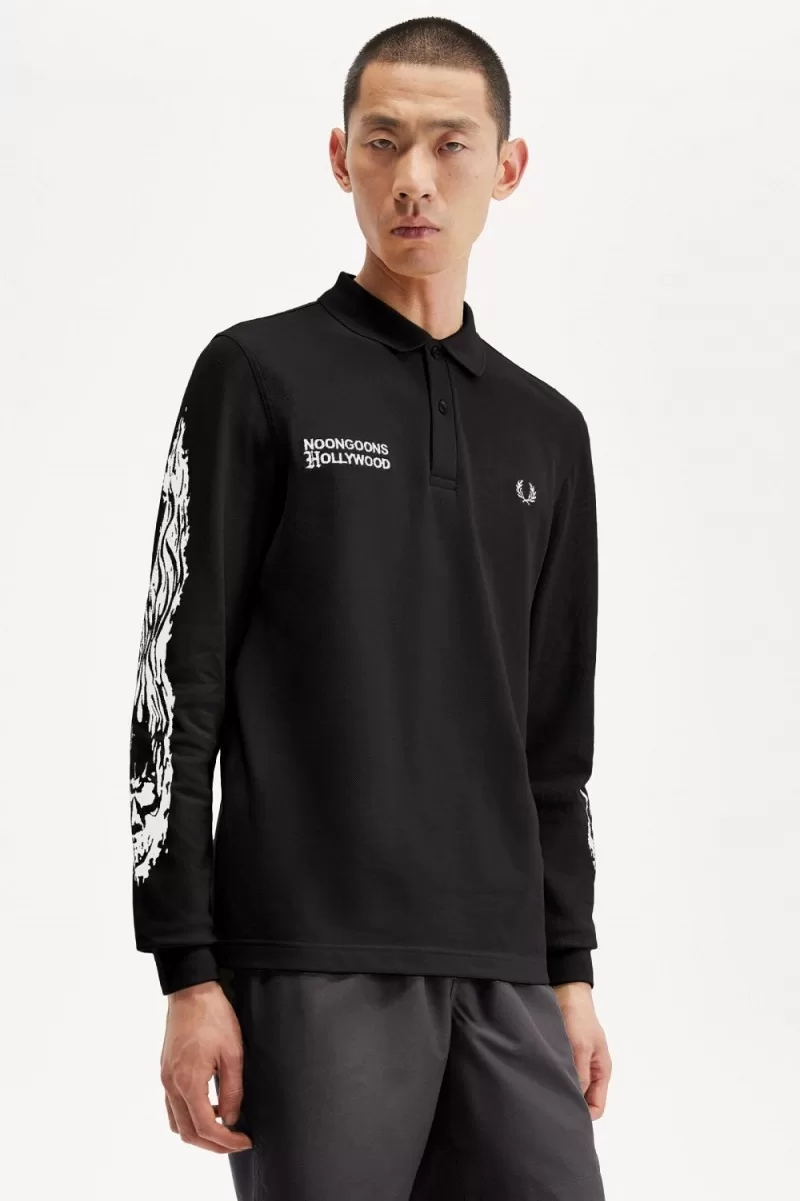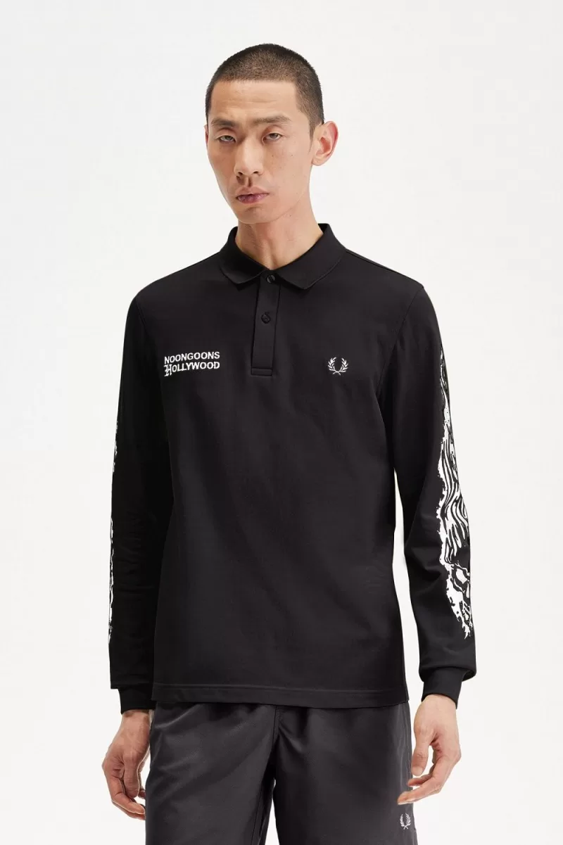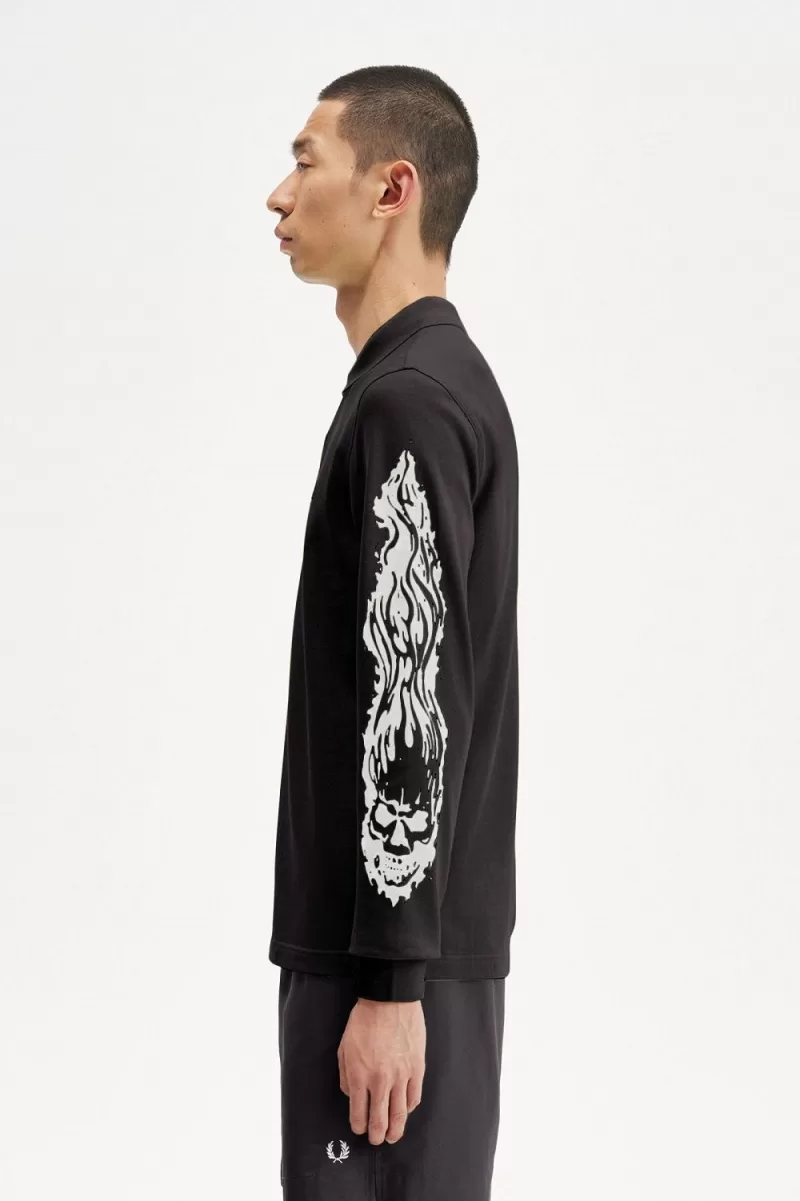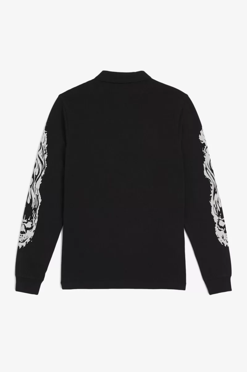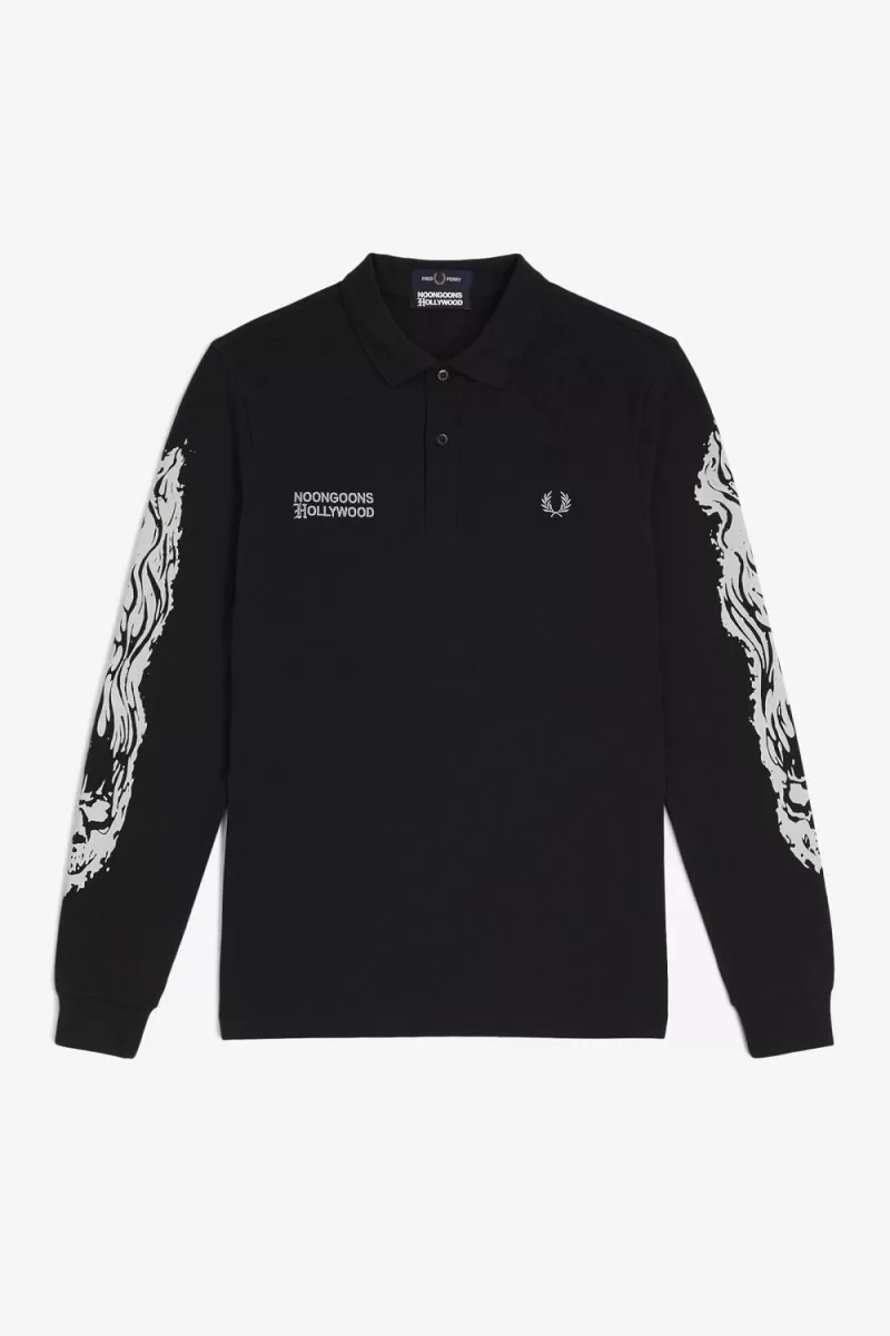 L.A. brand Noon Goons put their stamp on the Fred Perry Shirt, taking inspiration from the laid-back surf style of the West Coast. Printed with flame-encased skulls on the sleeves, with dual-branding embroidery on the chest.