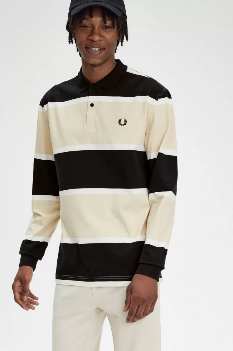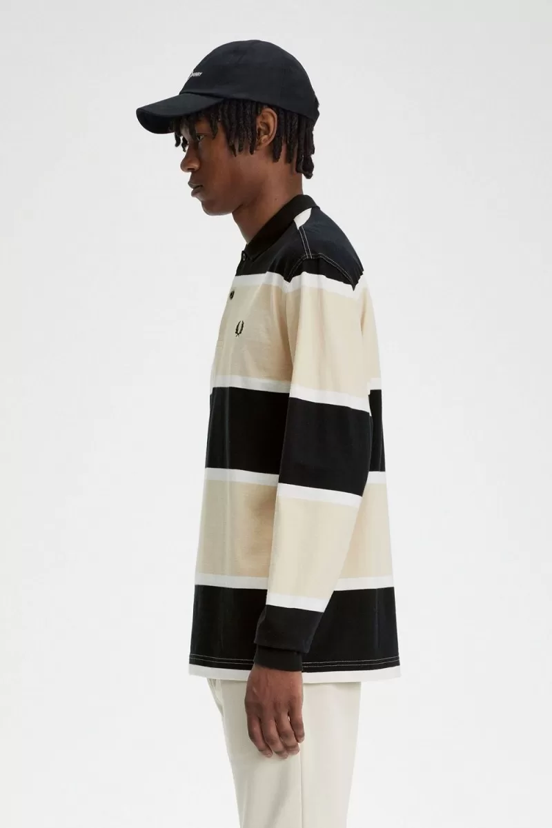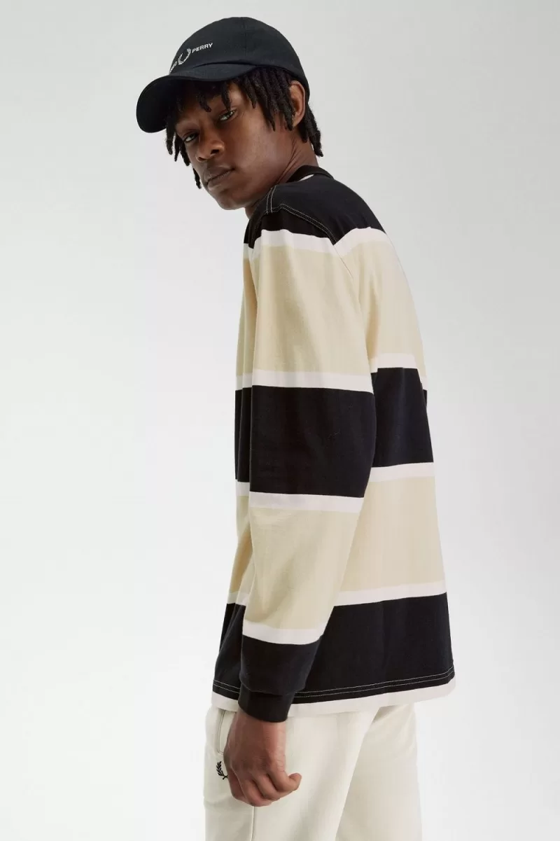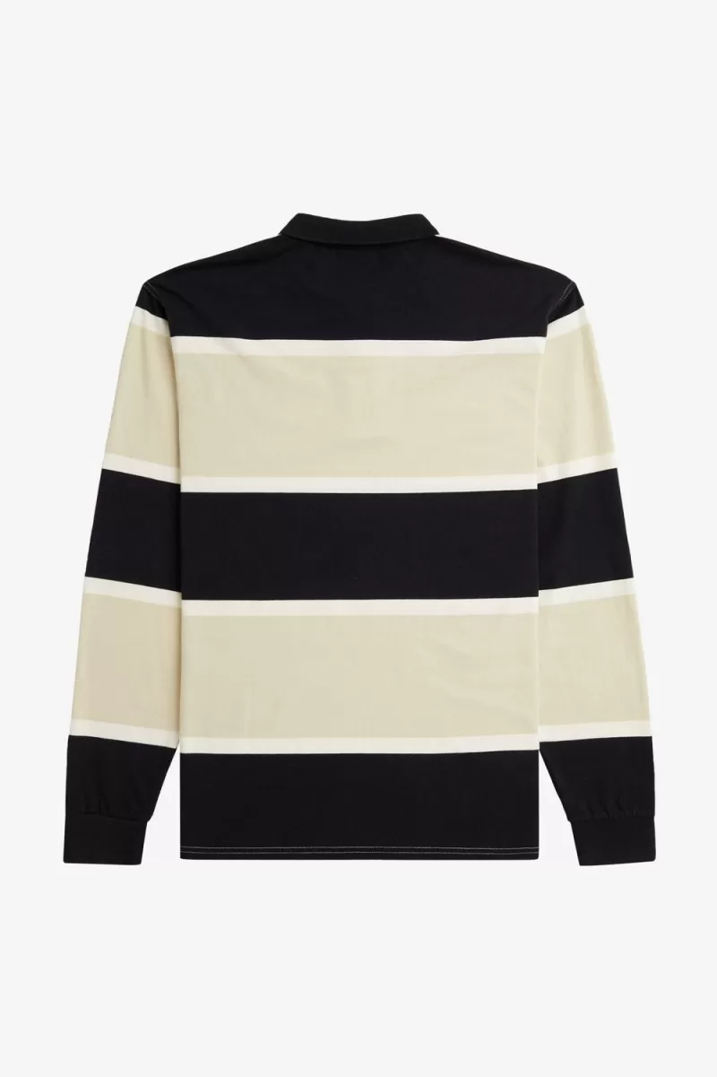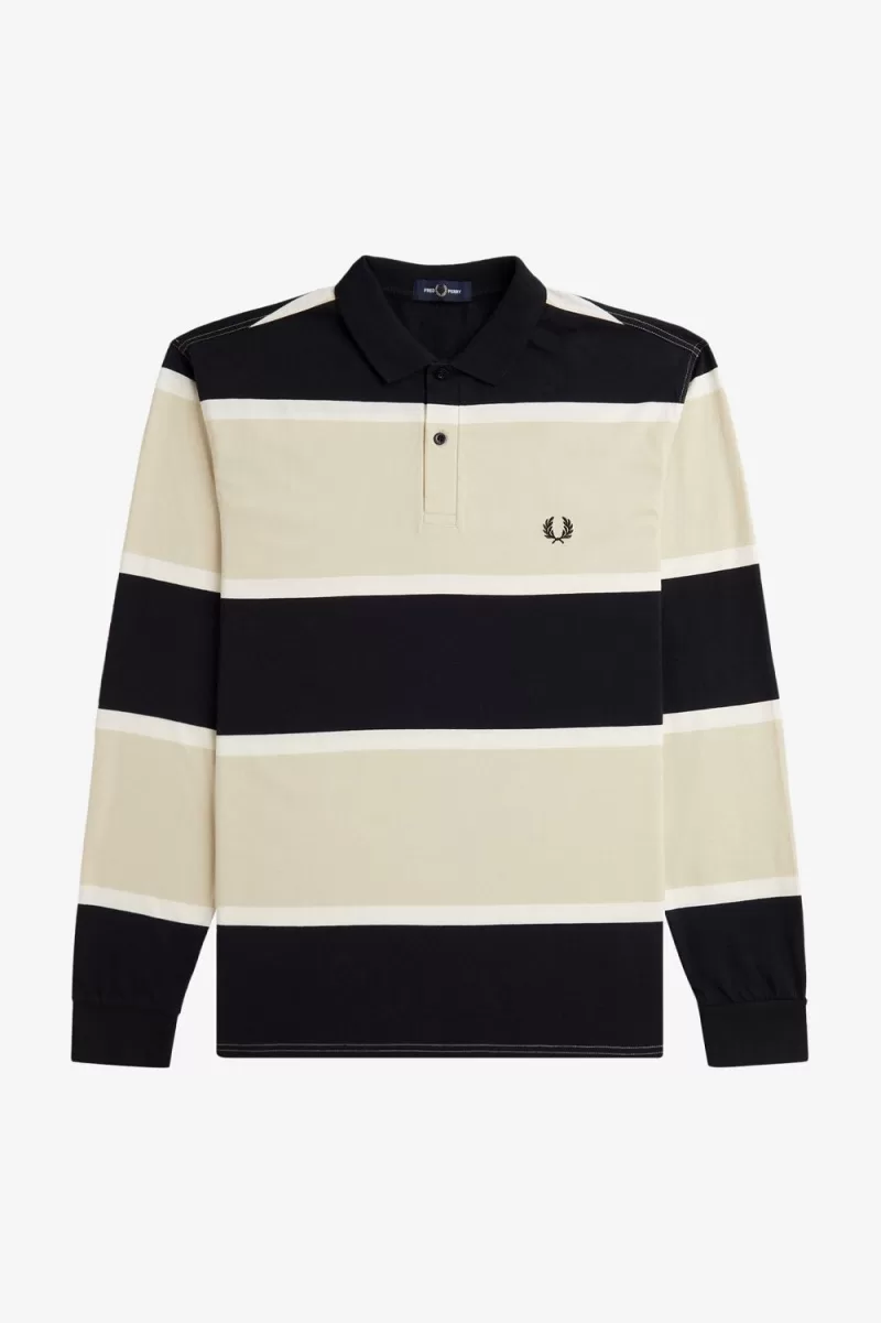 A long sleeve polo shirt in pure cotton jersey, with yarn dyed stripes and a button up collar.