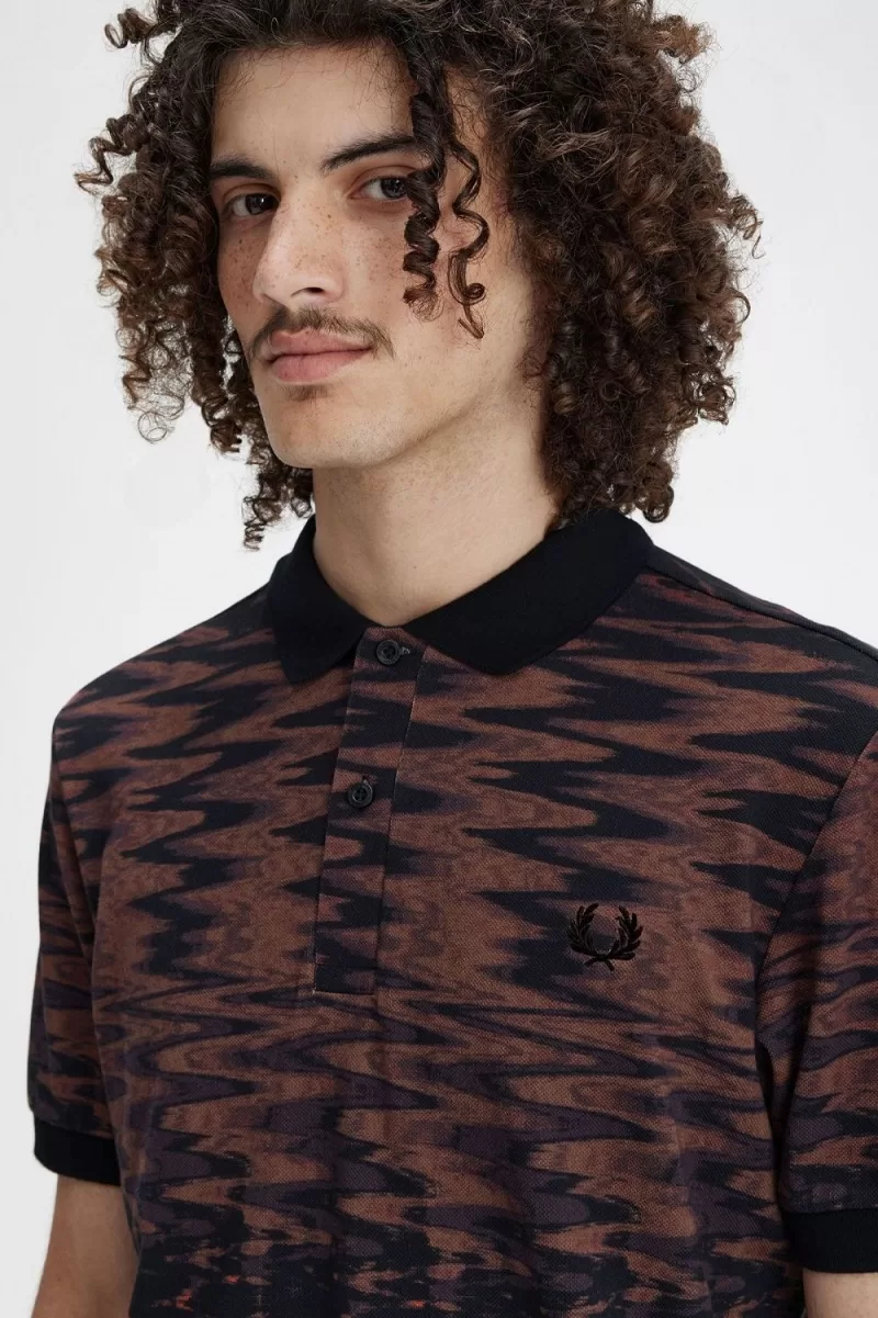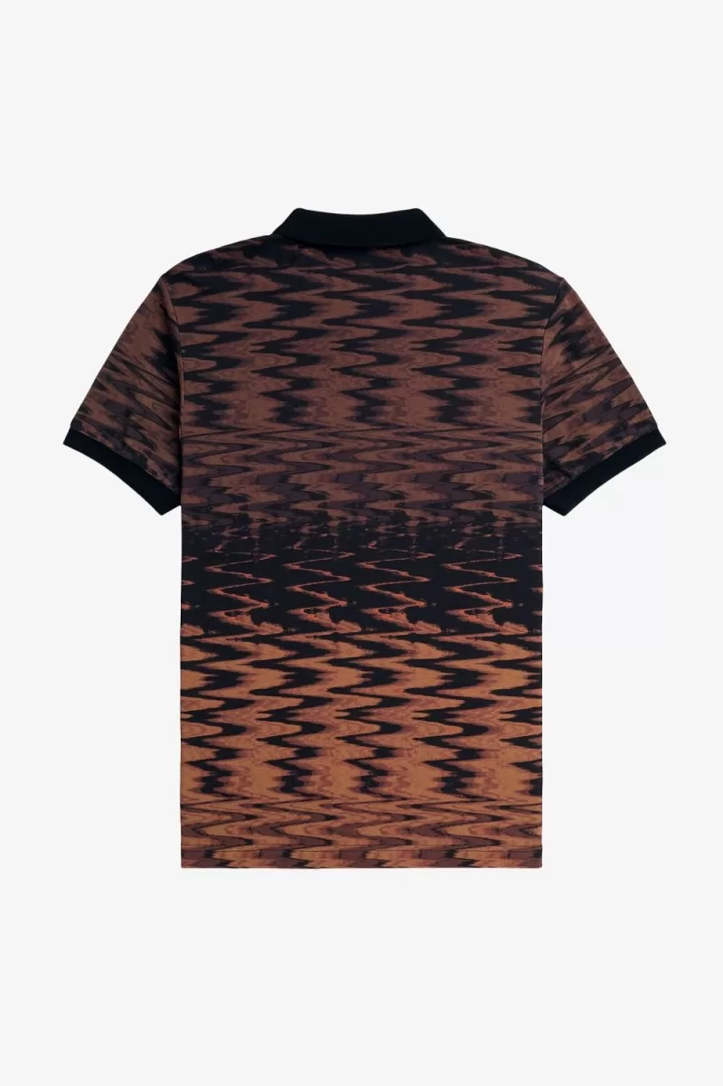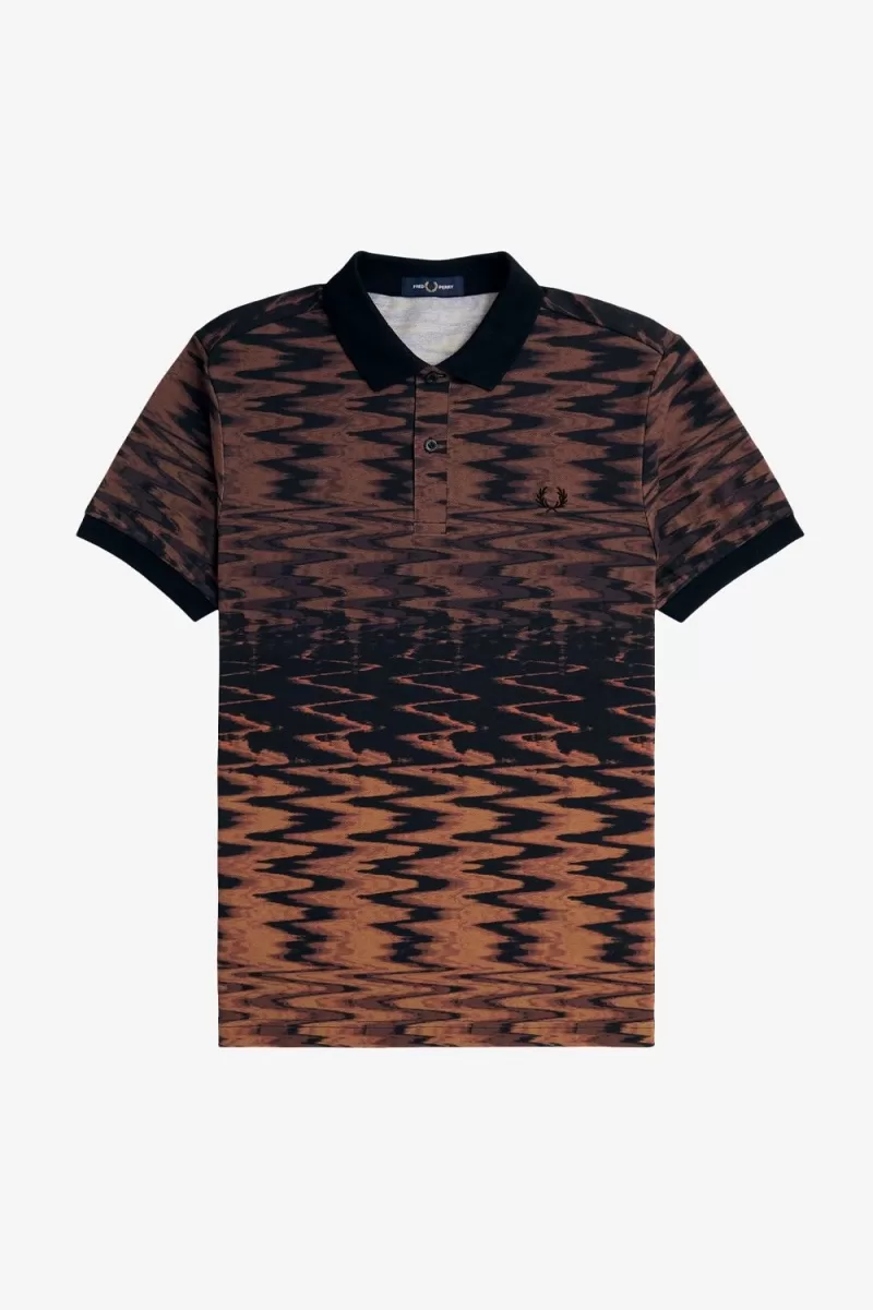 In all over digital print, our wave graphic Fred Perry polo shirt calls to mind the glitchy, lo-fi aesthetic of the ‘90s rave scene. Showing up with all the favourite features – including a two button placket, plain collar and cuffs, and our signature cotton piqué fabric, this is the centrepiece for your next after-dark outfit of choice.