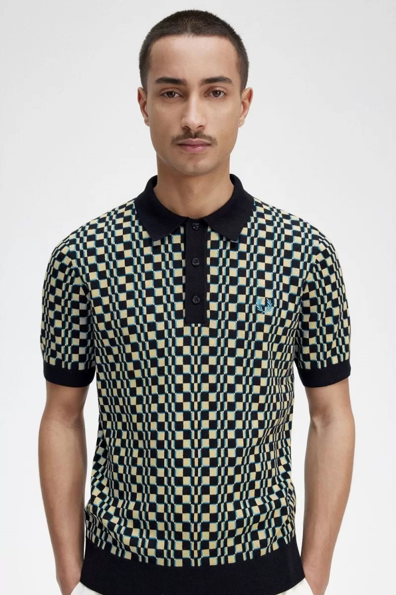 Our glitch print designs reference the screens and soundwaves of the ‘90s rave and techno scenes, when bold colours and abstract shapes took cues from the multi-coloured sportswear appearing across the European tennis circuit. Our glitch chequerboard knit shirt features the signature Laurel Wreath embroidery to the chest. Unmistakably Fred Perry.