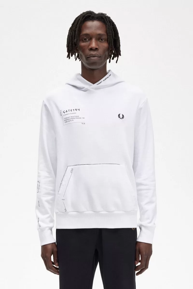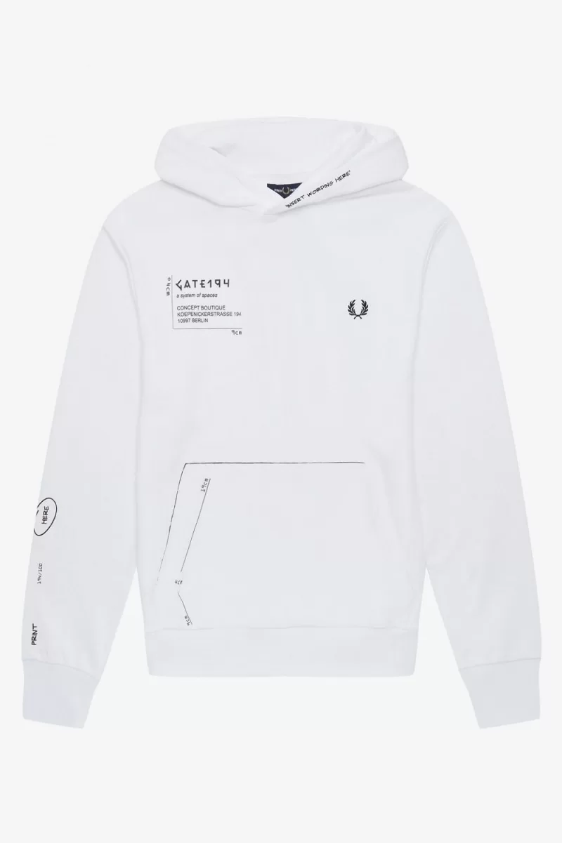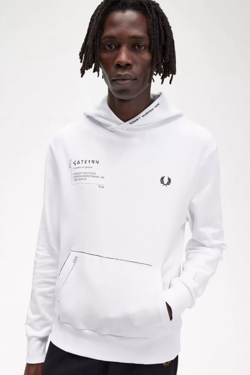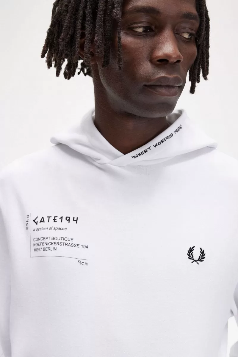Based in Berlin, GATE194 is an independent concept boutique and long-time Fred Perry stockist, embracing clashing cultures within fashion. Their curated selection of brands places East and West on the same rack, craftsmanship and innovation, luxury with utilitarianism, blending opposites to create something unique. Spurred on by their views of the contemporary fashion industry and its lack of transparency, GATE194 add screen-printed design annotations and placeholders to our hooded sweatshirt, highlighting their creative design process. Made in Portugal with refined features that embody GATE194 and their vision.