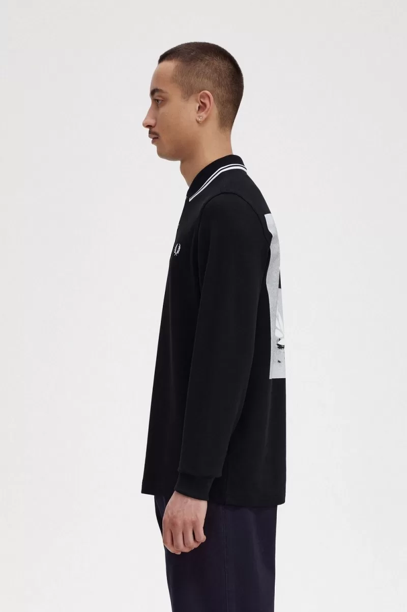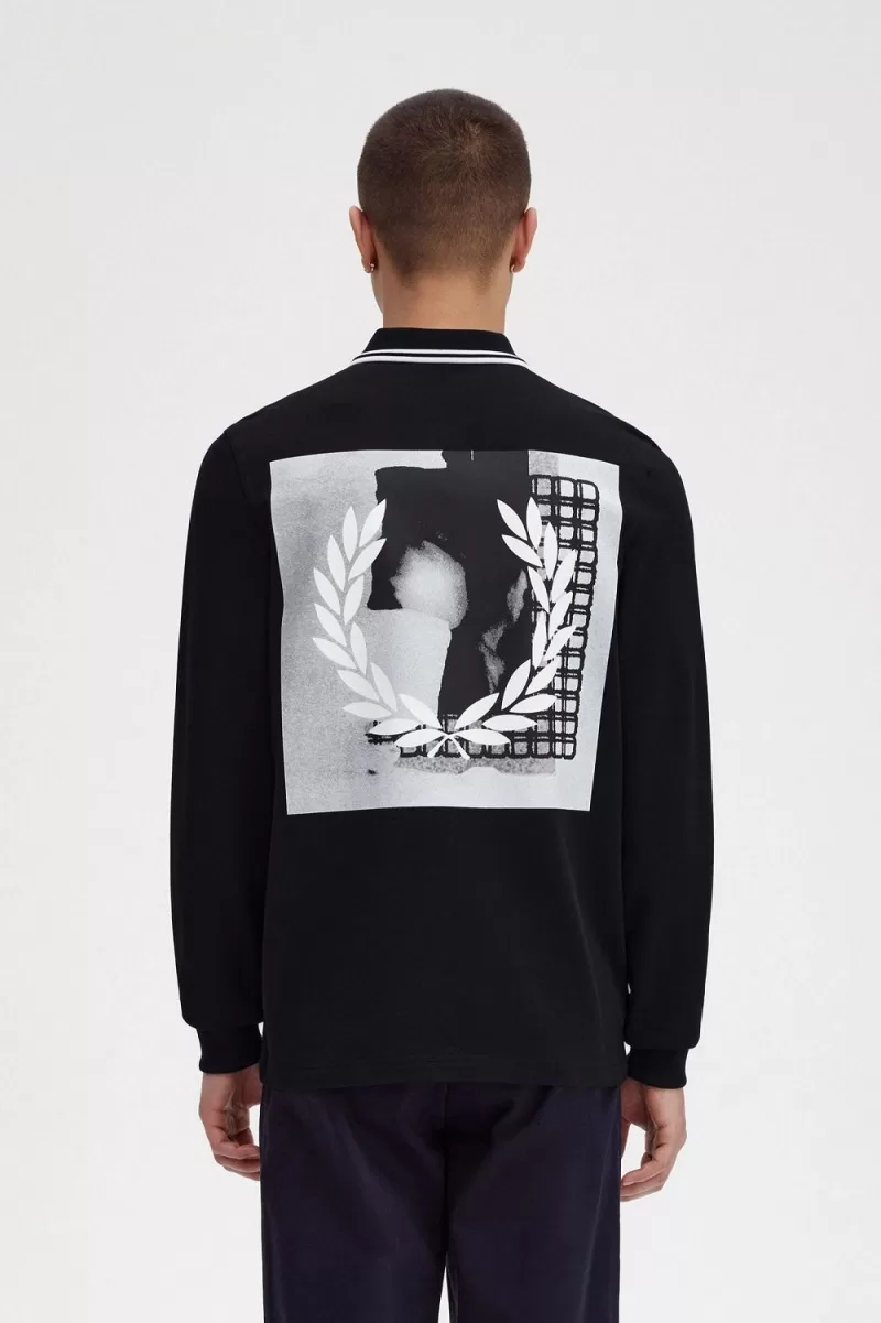 Our latest collection takes inspiration from British night life, where music and fashion collide. It champions individuality as much as togetherness. It’s the whole experience of going out – the outfits you spent weeks planning, the buzz on the bus journey there, the strangers who become mates in the smoking area, the unrivalled joy of being together on the dancefloor. A bold, high contrast print covers the back of our rave graphic long sleeve Fred Perry shirt, with an embroidered logo on the left hand chest projected in oversized relief on the back.