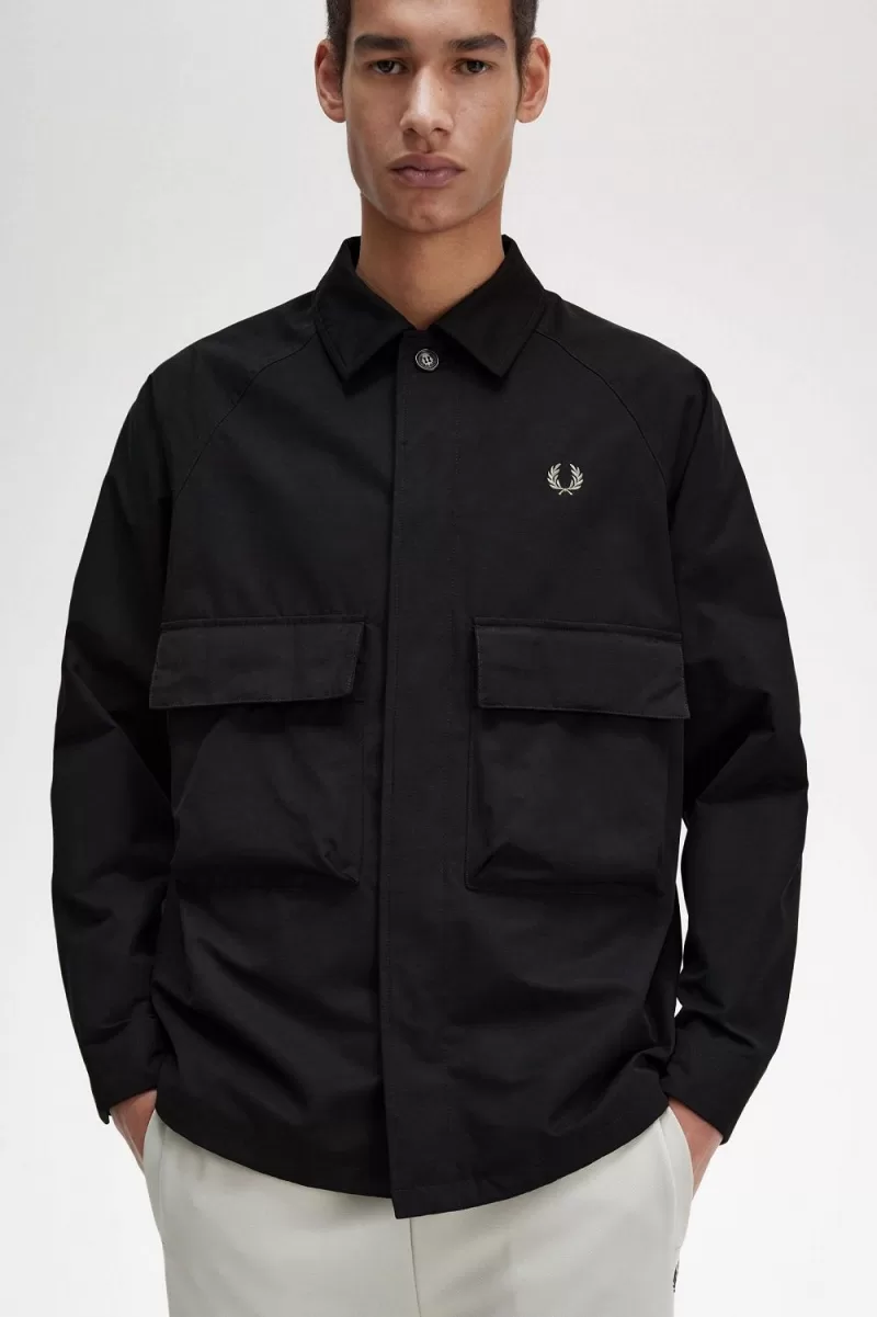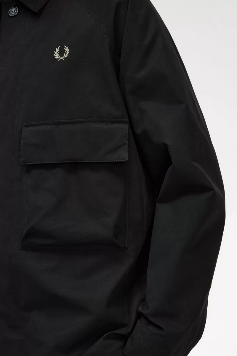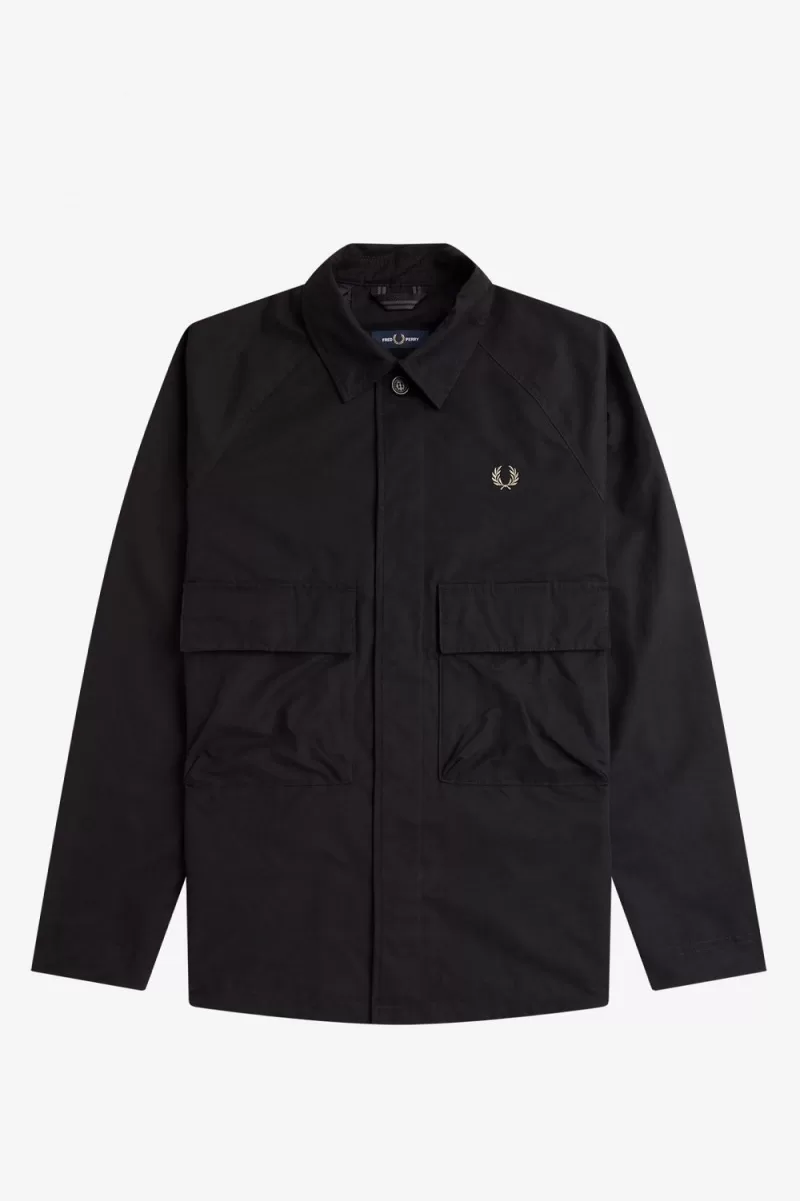 Cotton and polyester blend fabric / Classic fit with a curved hem and raglan sleeve / Button through design / Large patch pockets / Embroidered Laurel Wreath logo on the left hand chest