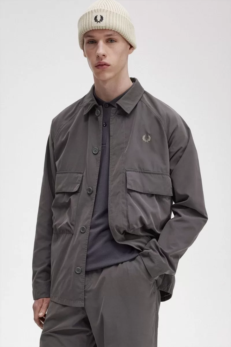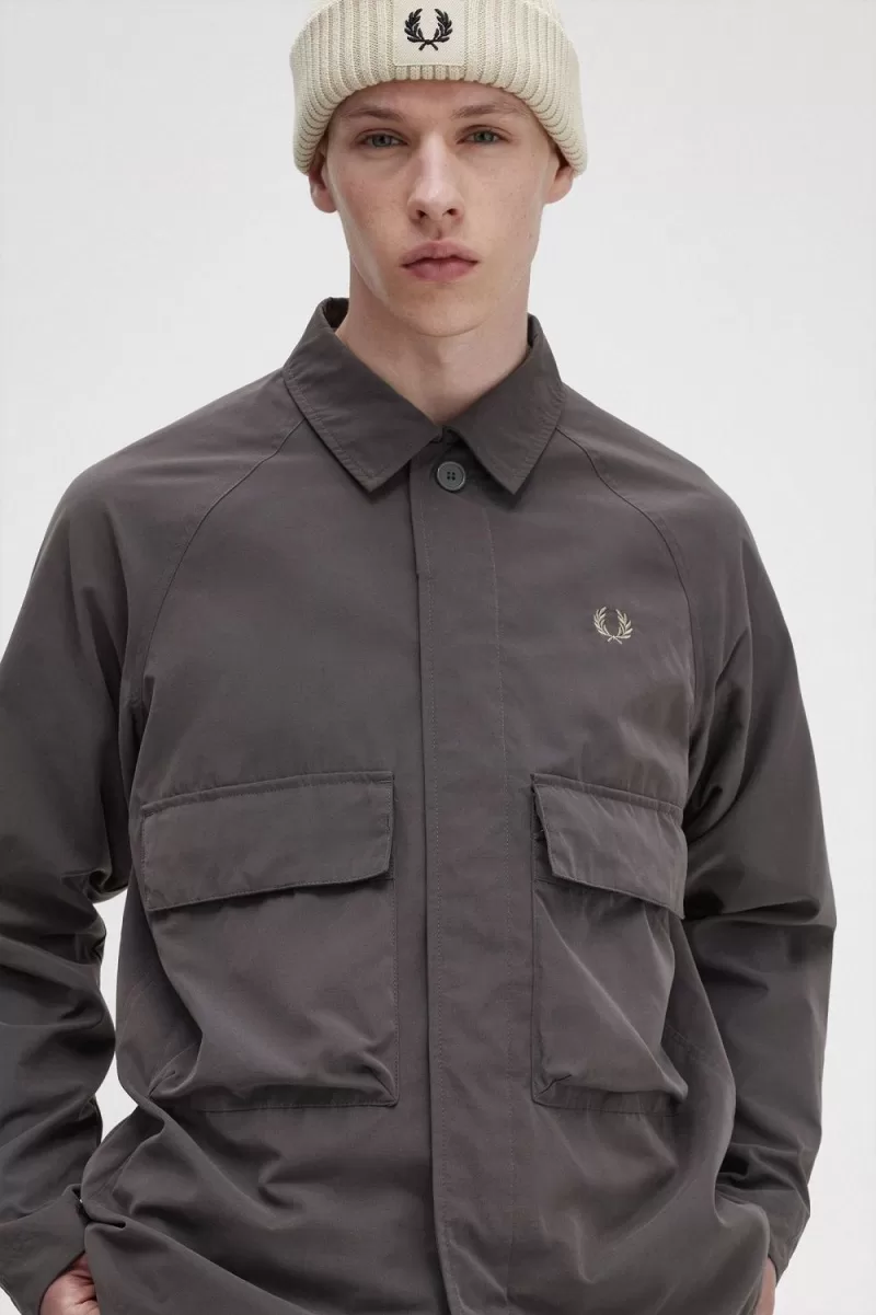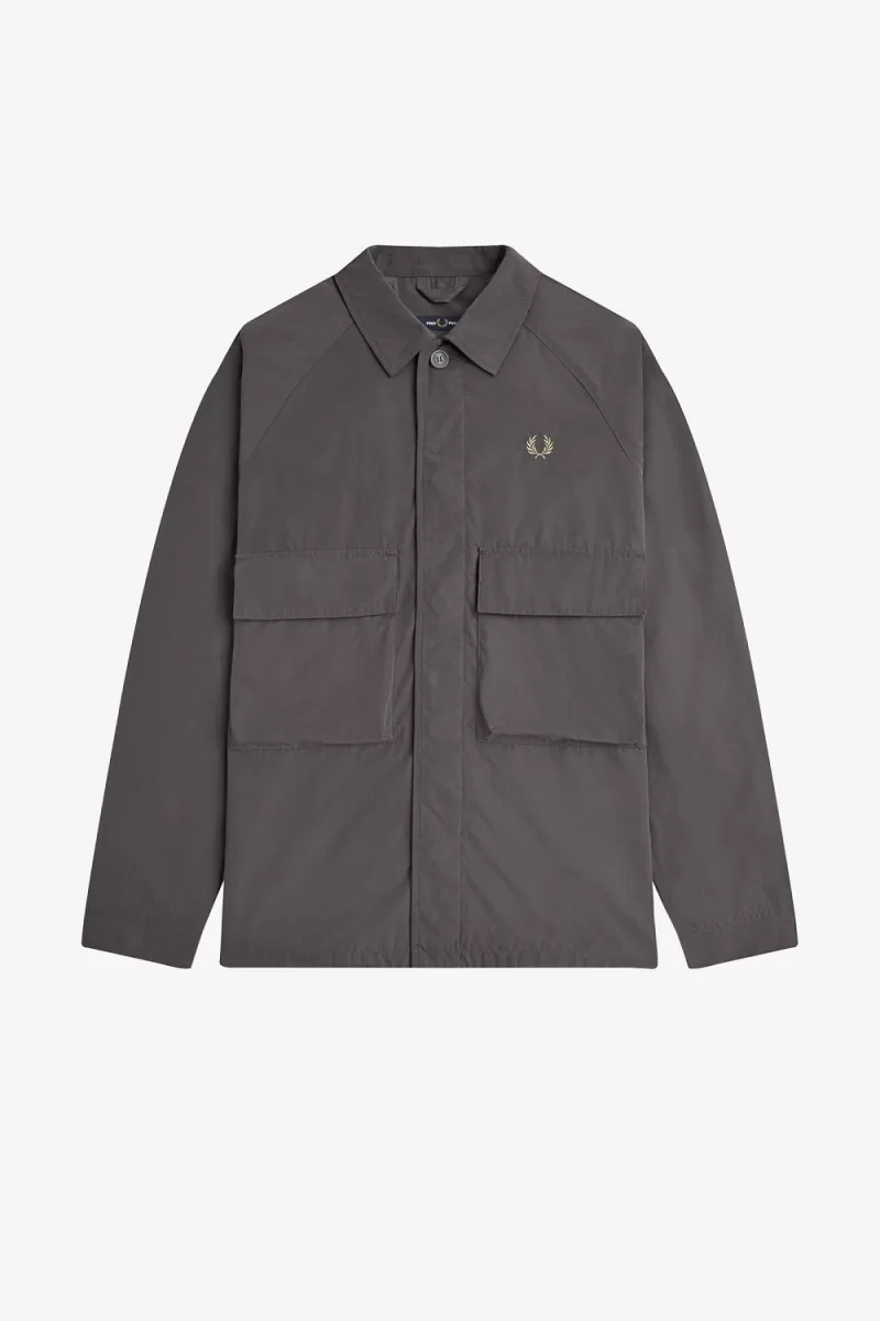Cotton and polyester blend fabric / Classic fit with a curved hem and raglan sleeve / Button through design / Large patch pockets / Embroidered Laurel Wreath logo on the left hand chest