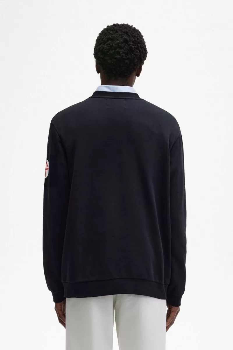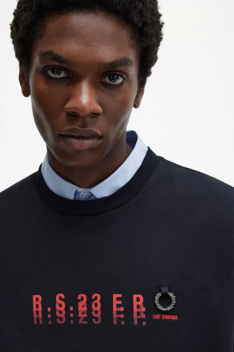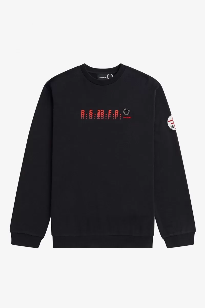 Raf Simons reinterprets familiar Fred Perry silhouettes with the sensibilities of his eponymous line and influenced by the clothes worn at raves, club nights and gigs. Inspired by his fascination with utilitarian uniforms and graphics taken from fictional early industrial records of the late ‘70s, our latest Raf Simons collection is as at home on the floor of a techno rave as it is at a packed band show. Our printed sweatshirt features a dropped shoulder, bespoke graphics to the front and left sleeve, plus a silver metal Laurel Wreath to the left chest, above Raf Simons signature embroidery. A reimagined classic, that combines conventional style with a rebellious spirit. To wear the Fred Perry x Raf Simons collection is to feel part of something – the power of youth and belonging.