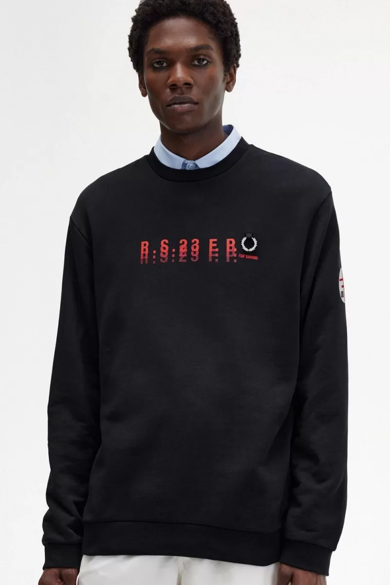 Cotton loopback sweat / Regular fit with dropped shoulder / Printed graphics on front body and left sleeve / Rib neck, cuff and hem / Silver metal Laurel Wreath and Raf Simons embroidery on left chest