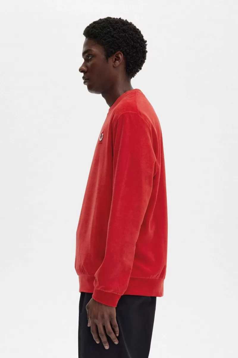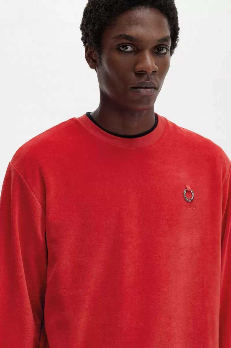 Raf Simons reinterprets familiar Fred Perry silhouettes with the sensibilities of his eponymous line and influenced by the clothes worn at raves, club nights and gigs. Inspired by his fascination with utilitarian uniforms and graphics taken from fictional early industrial records of the late ‘70s, our latest Raf Simons collection is as at home on the floor of a techno rave as it is at a packed band show. Our sweatshirt is crafted from a silky velour fabric, features a dropped shoulder and a silver metal Laurel Wreath to the left chest, above Raf Simons signature embroidery. A reimagined classic, that combines conventional style with a rebellious spirit. To wear the Fred Perry x Raf Simons collection is to feel part of something – the power of youth and belonging.
