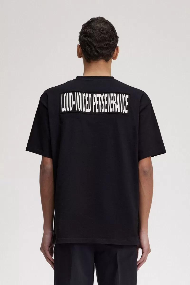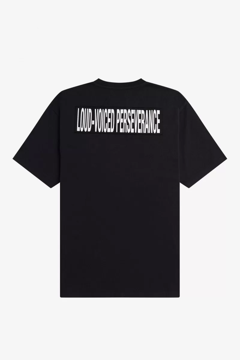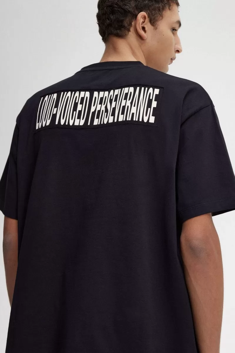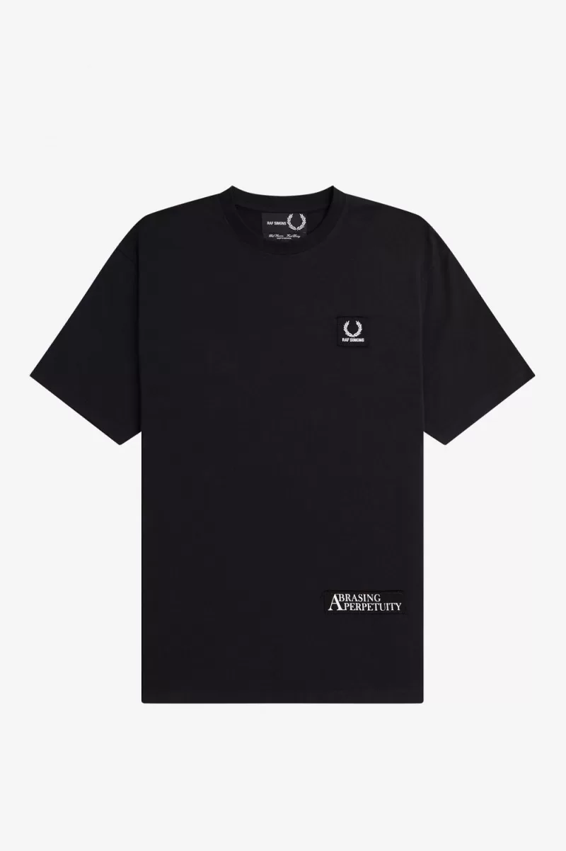 We collaborate with Raf Simons on a cotton jersey t-shirt with bespoke graphic lettering and a dual branded patch.