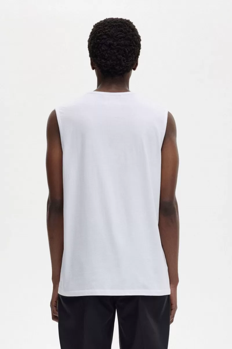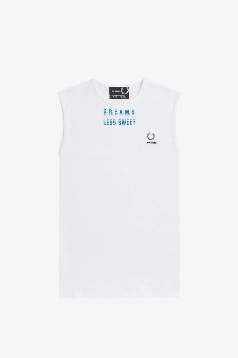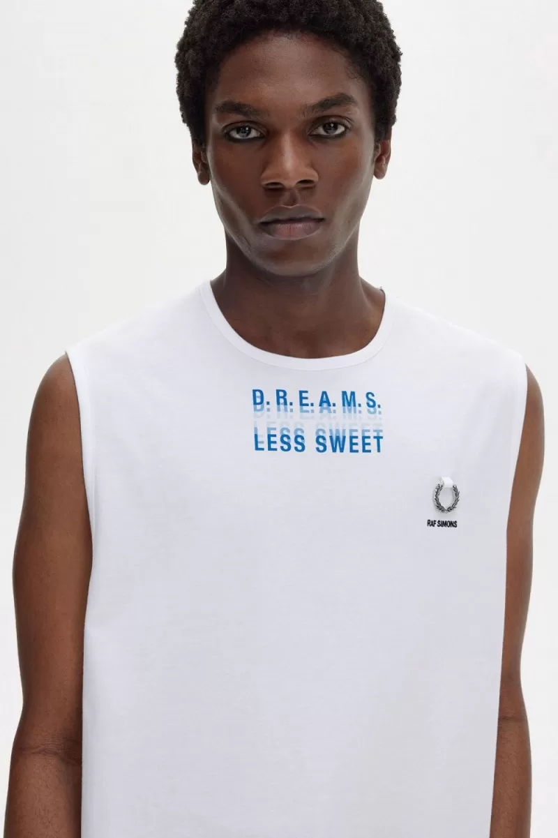 Raf Simons reinterprets familiar Fred Perry silhouettes with the sensibilities of his eponymous line and influenced by the clothes worn at raves, club nights and gigs. Inspired by his fascination with utilitarian uniforms and graphics taken from fictional early industrial records of the late ‘70s, our latest Raf Simons collection is as at home on the floor of a techno rave as it is at a packed band show. Our printed vest comes in a relaxed fit, is crafted from a cotton jersey and features a graphic to the front and a silver metal Laurel Wreath above Raf Simons embroidery on the left chest. A reimagined classic, that combines conventional style with a rebellious spirit. To wear the Fred Perry x Raf Simons collection is to feel part of something – the power of youth and belonging.