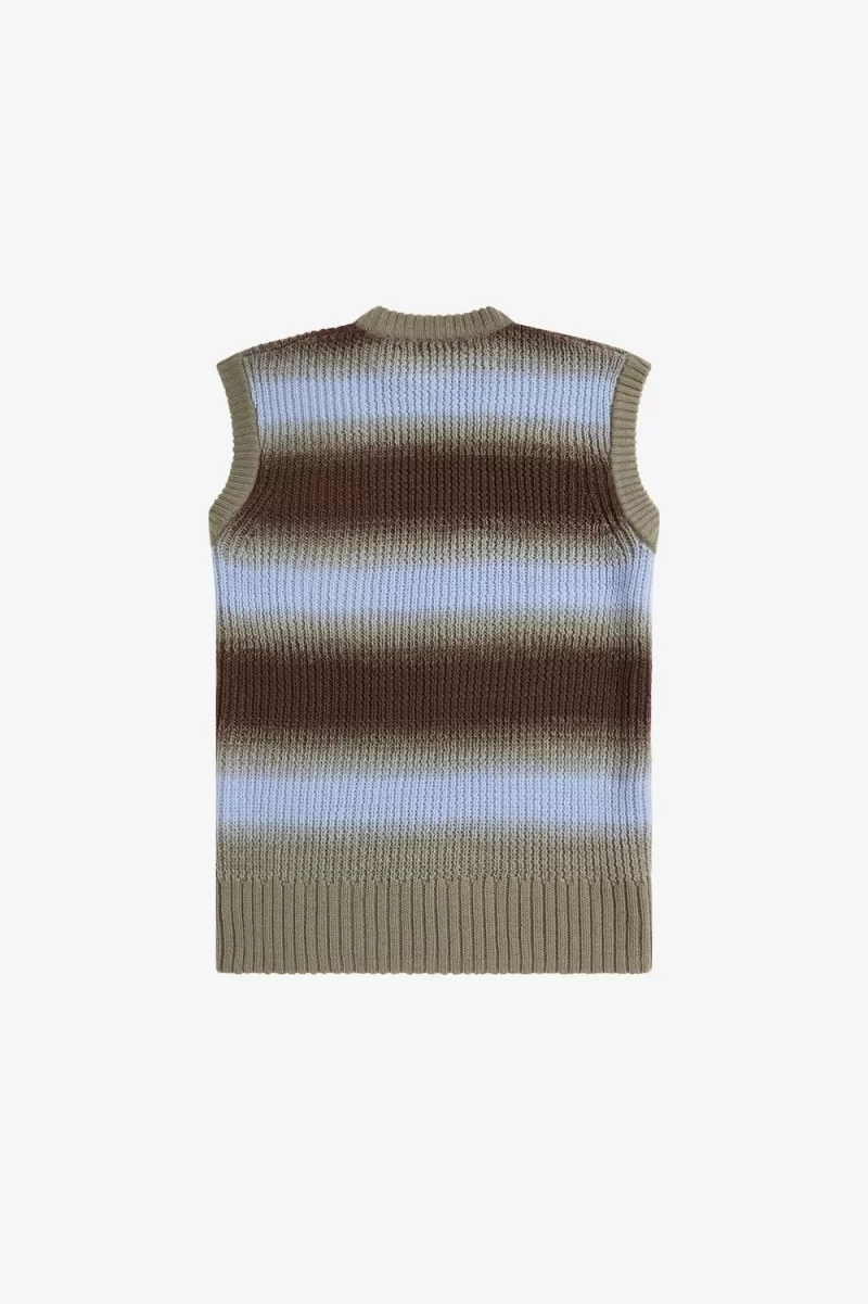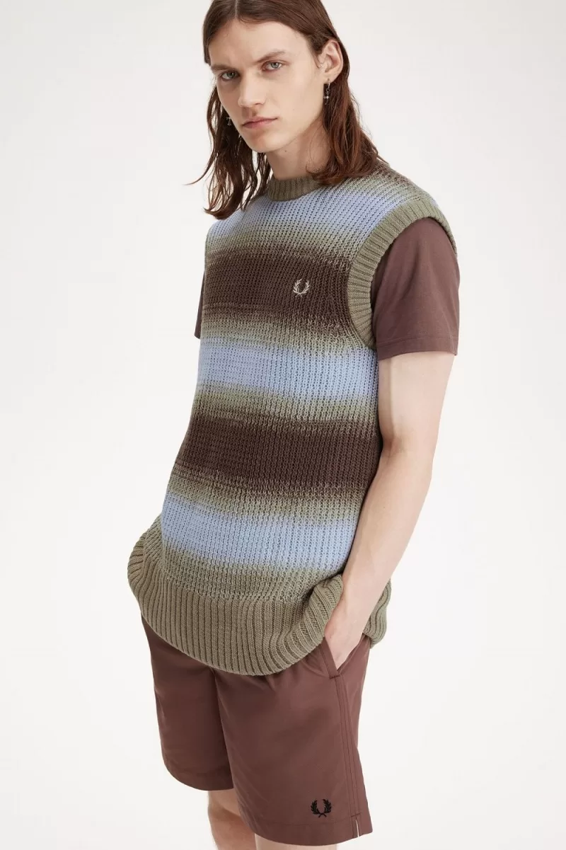 A knitted tank in a blend of merino wool and partially recycled acrylic, designed with a chunky loose knit structure and ombre stripe design.
