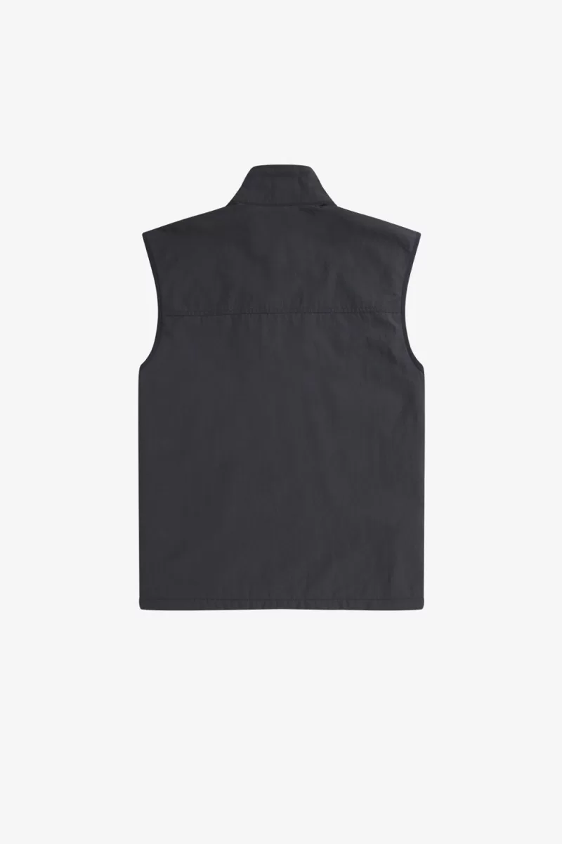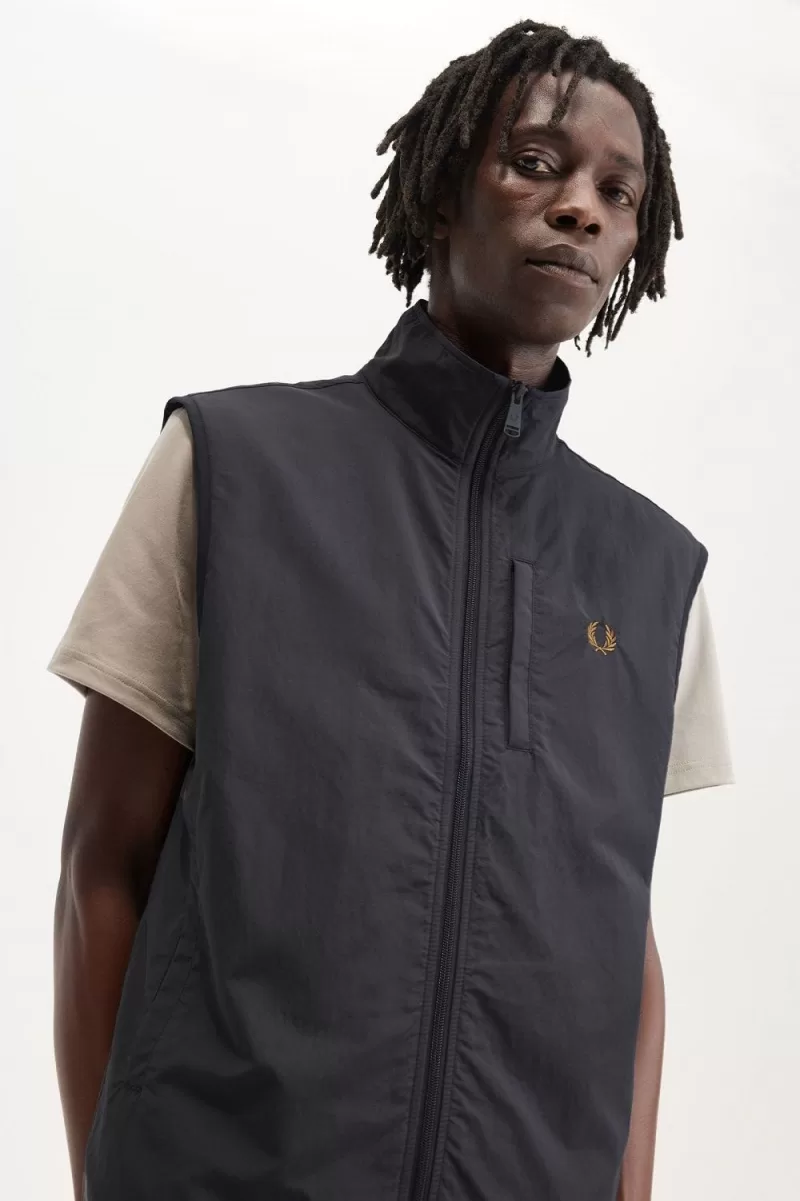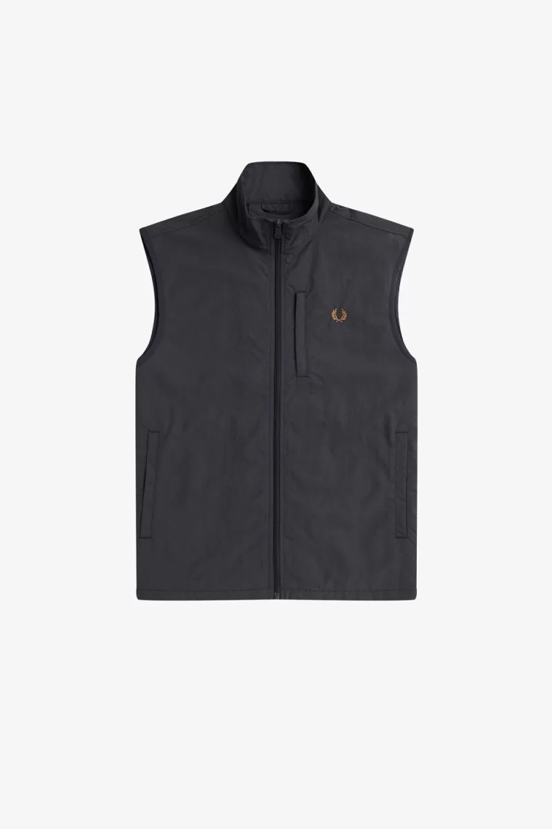 Our lined gilet in recycled fabric, with a smart elevated collar and contrast binding.