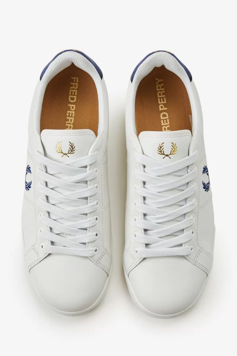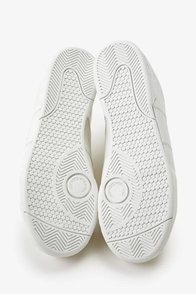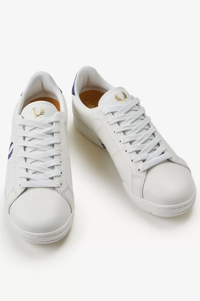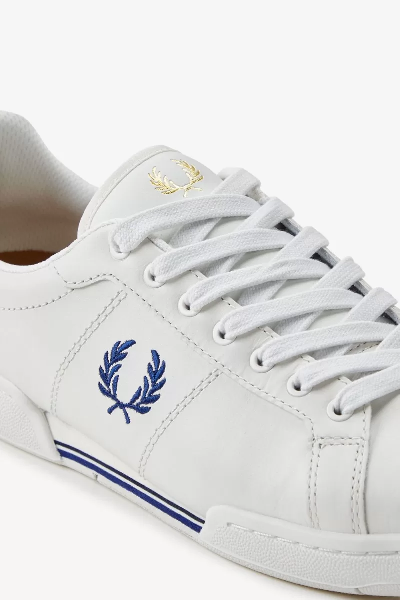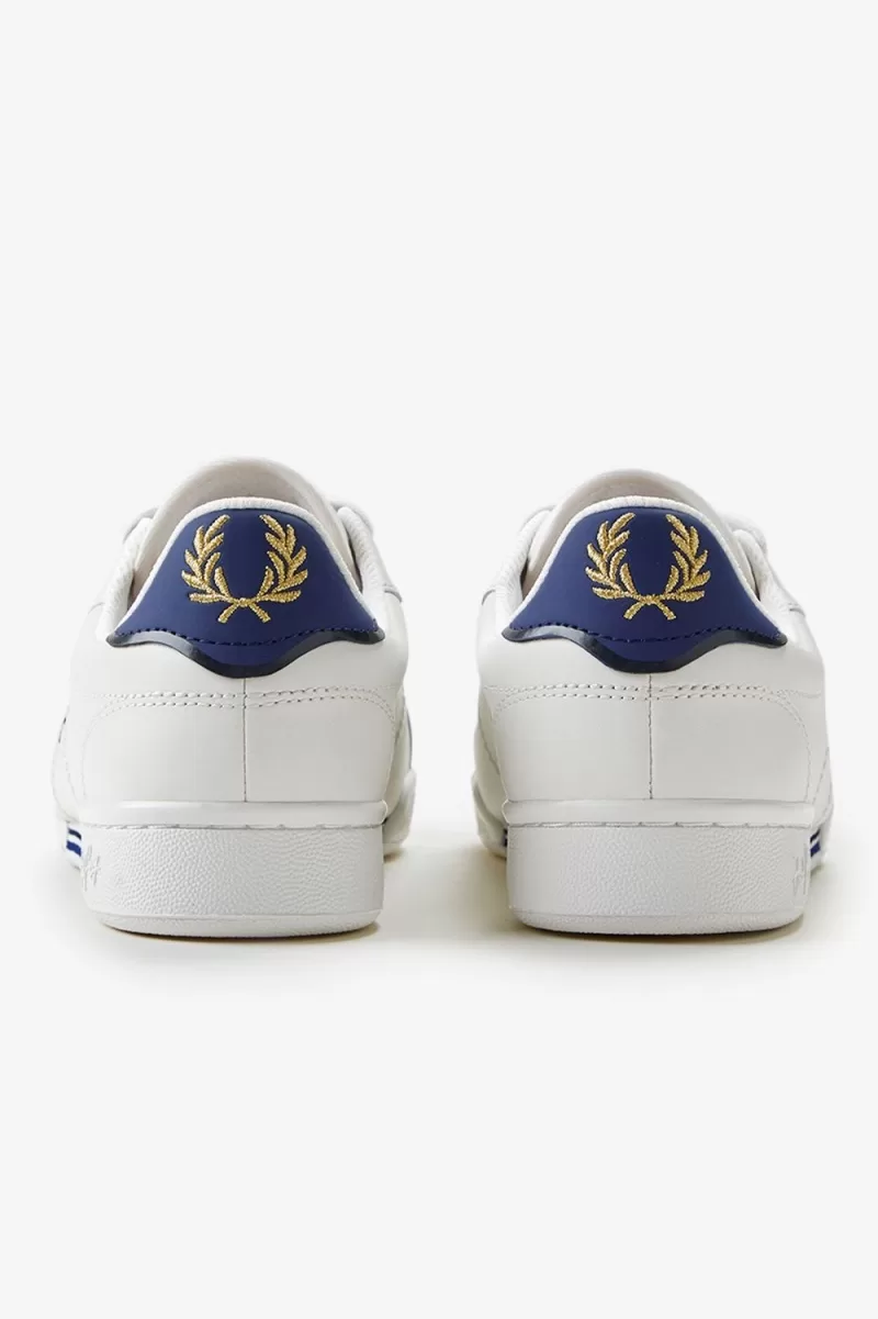 Our B722 tennis shoe in leather, designed with a contrast heel tab and tipping detail in familiar Fred Perry colours.