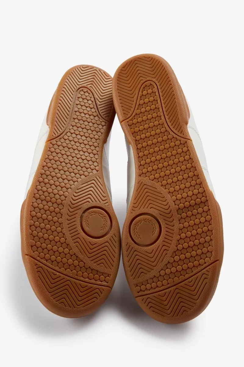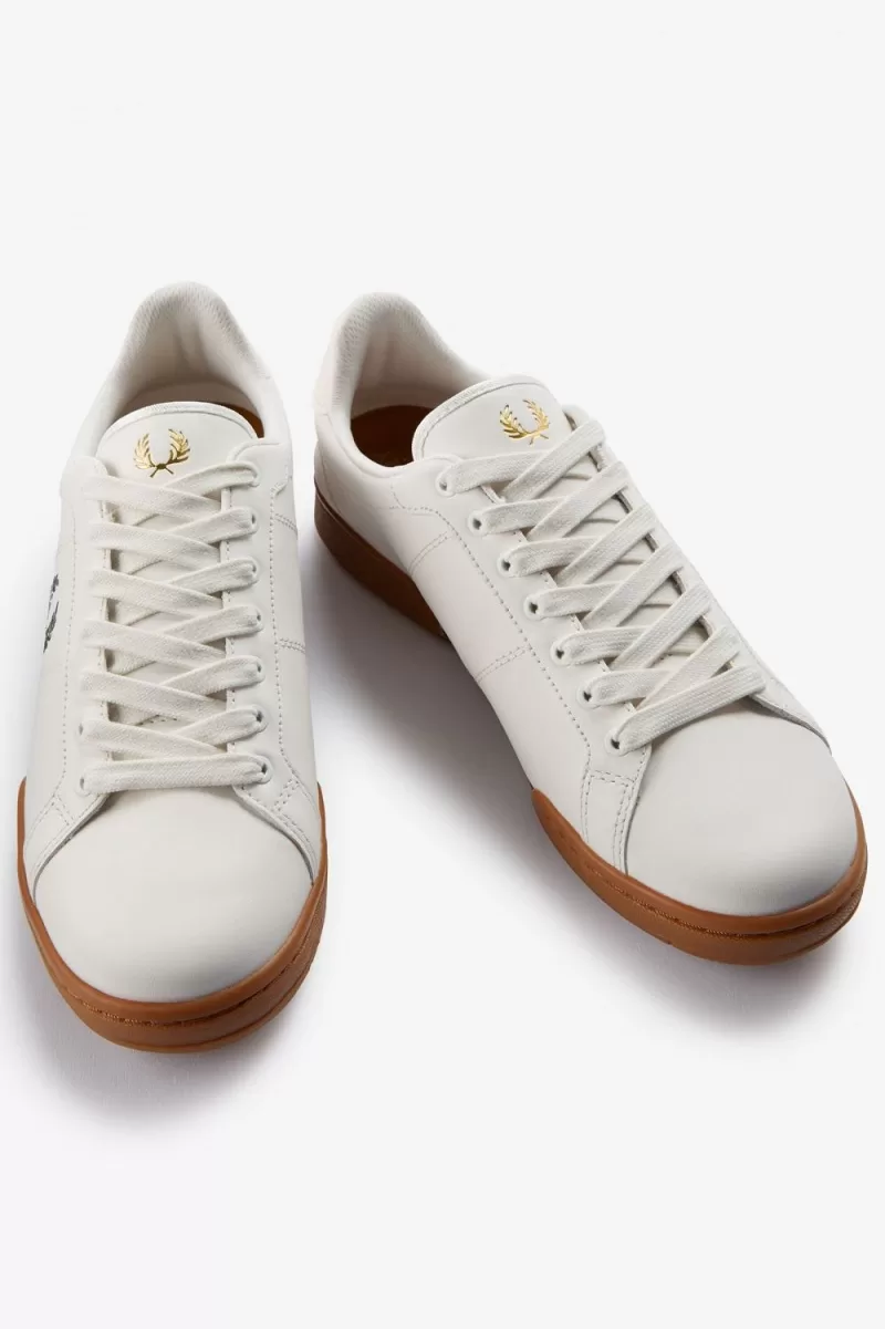 Our B722 tennis shoe in leather, designed with a contrast heel tab and tipping detail in familiar Fred Perry colours.