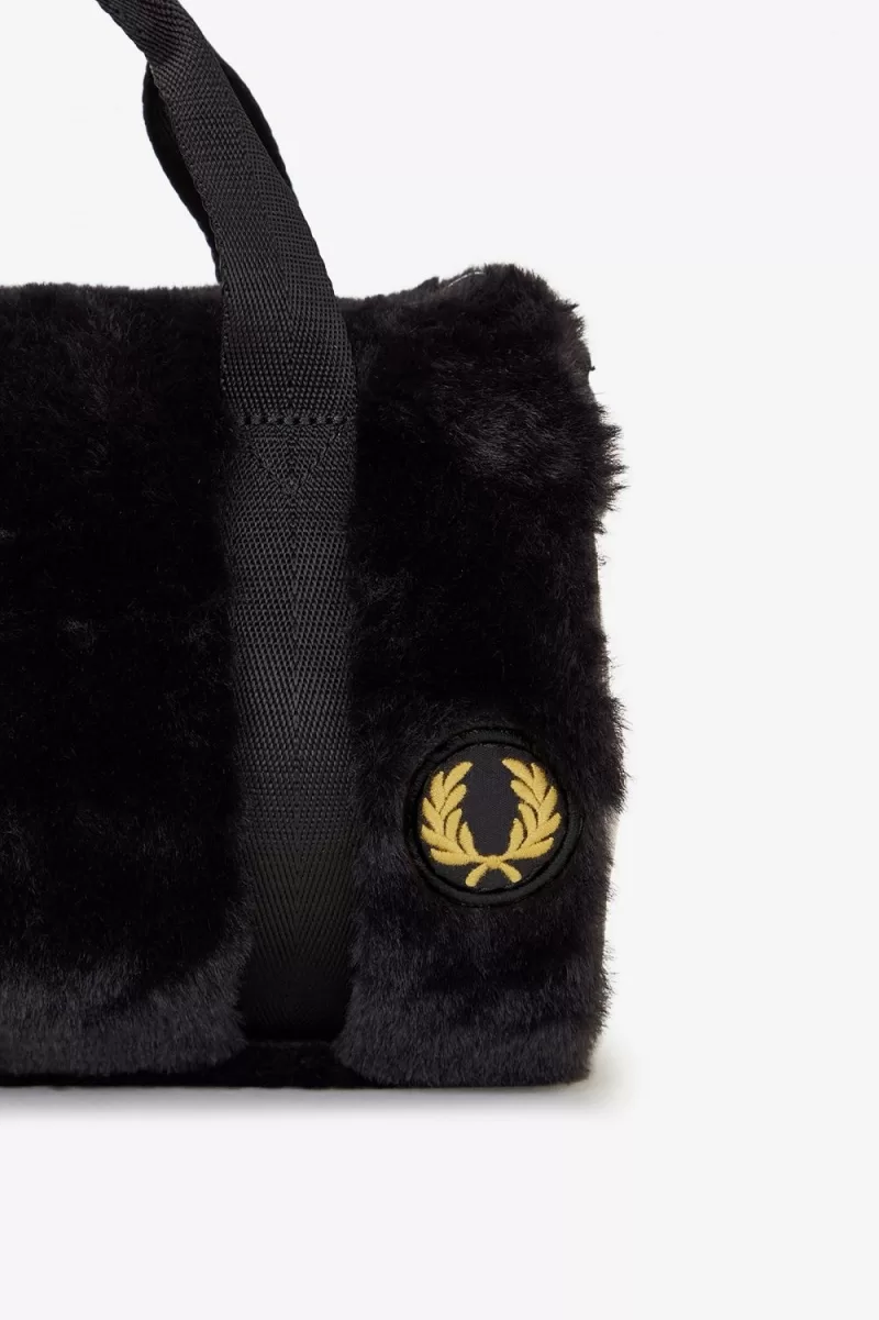 Recycled faux fur fabric / PU trims and outer badges / Branded cotton internal lining / Webbed handles and detachable shoulder strap / Embroidered heart patches and Laurel Wreath