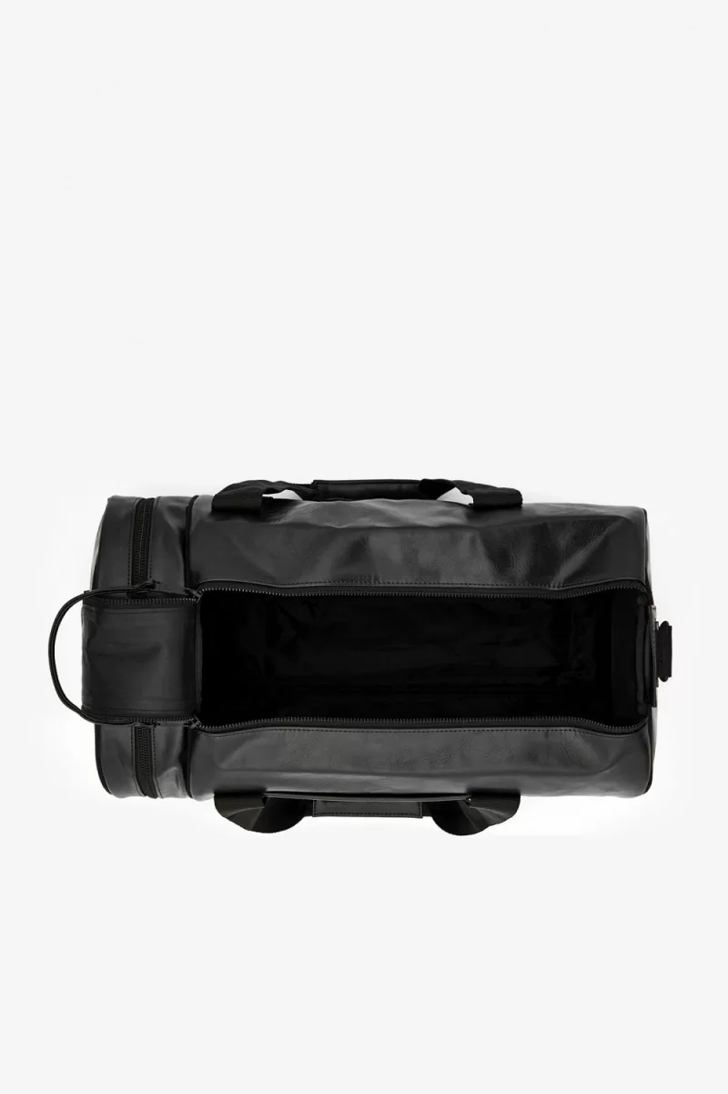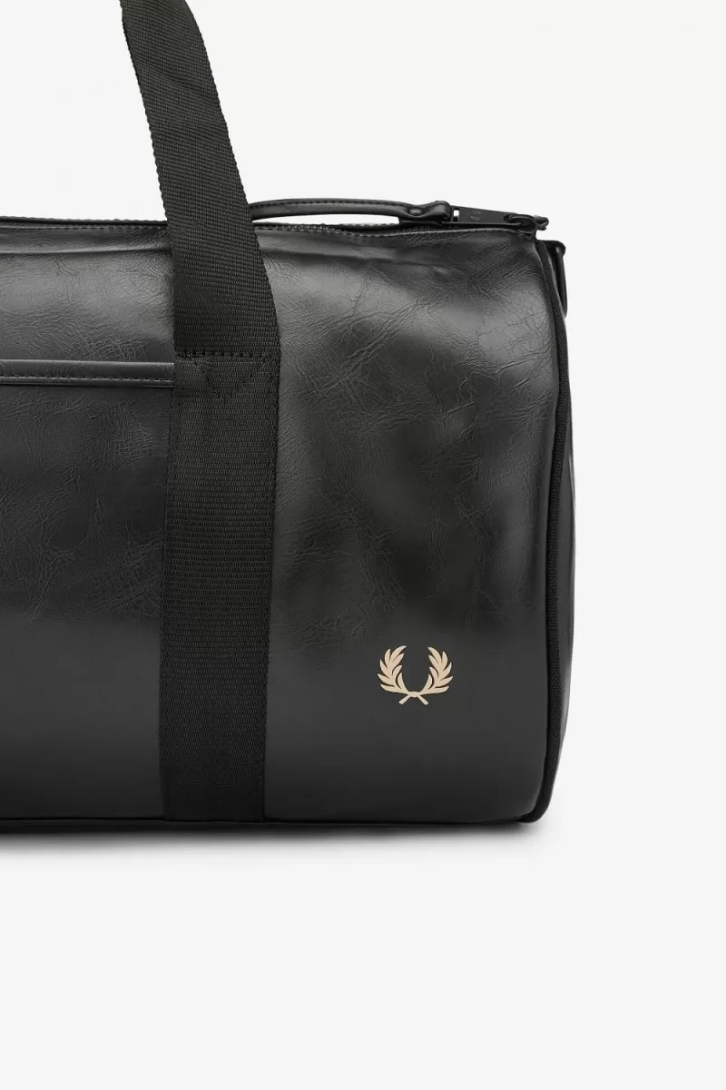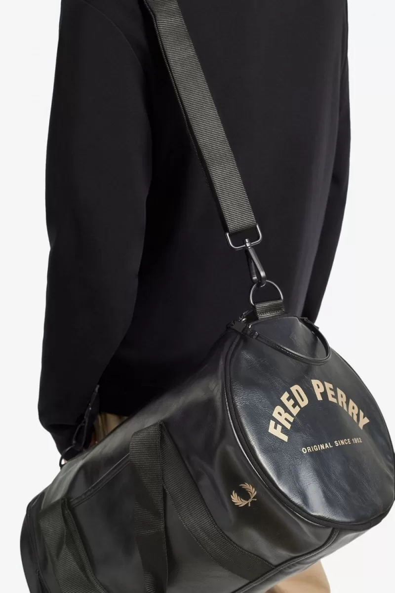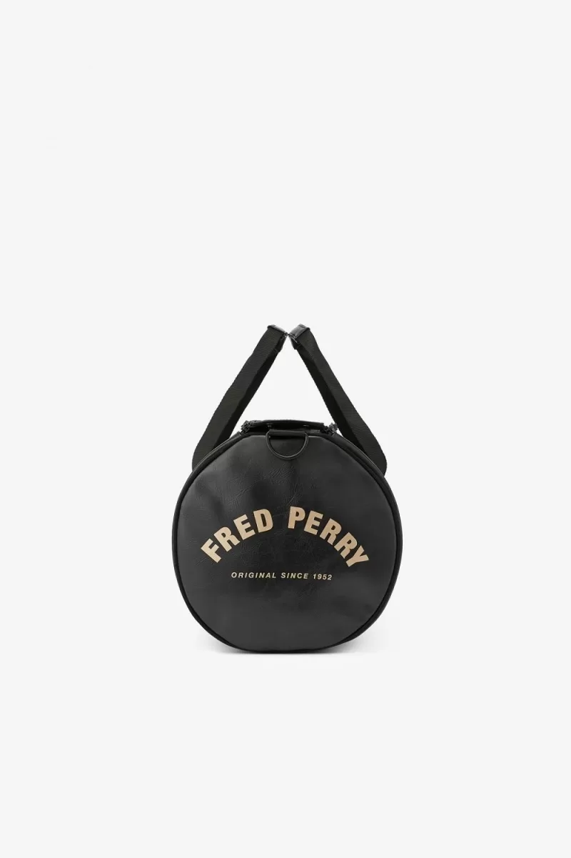 The classic Fred Perry barrel bag in durable PU, designed with tonal detailing. Fitted with strong webbing handles, a zipped compartment at one end and signature arch branding.