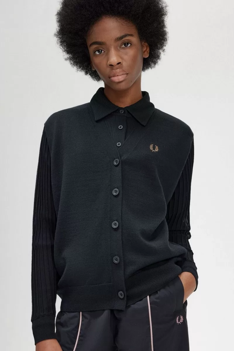 Sometimes less is more. Constructed with sheer sleeves, this cardigan is smart without forgetting where it came from. A sharp collar and subtle details make this a modernist piece, built for layering. Knitted in a blend of cotton and Merino wool for a soft hand feel and a sports luxe finish.
