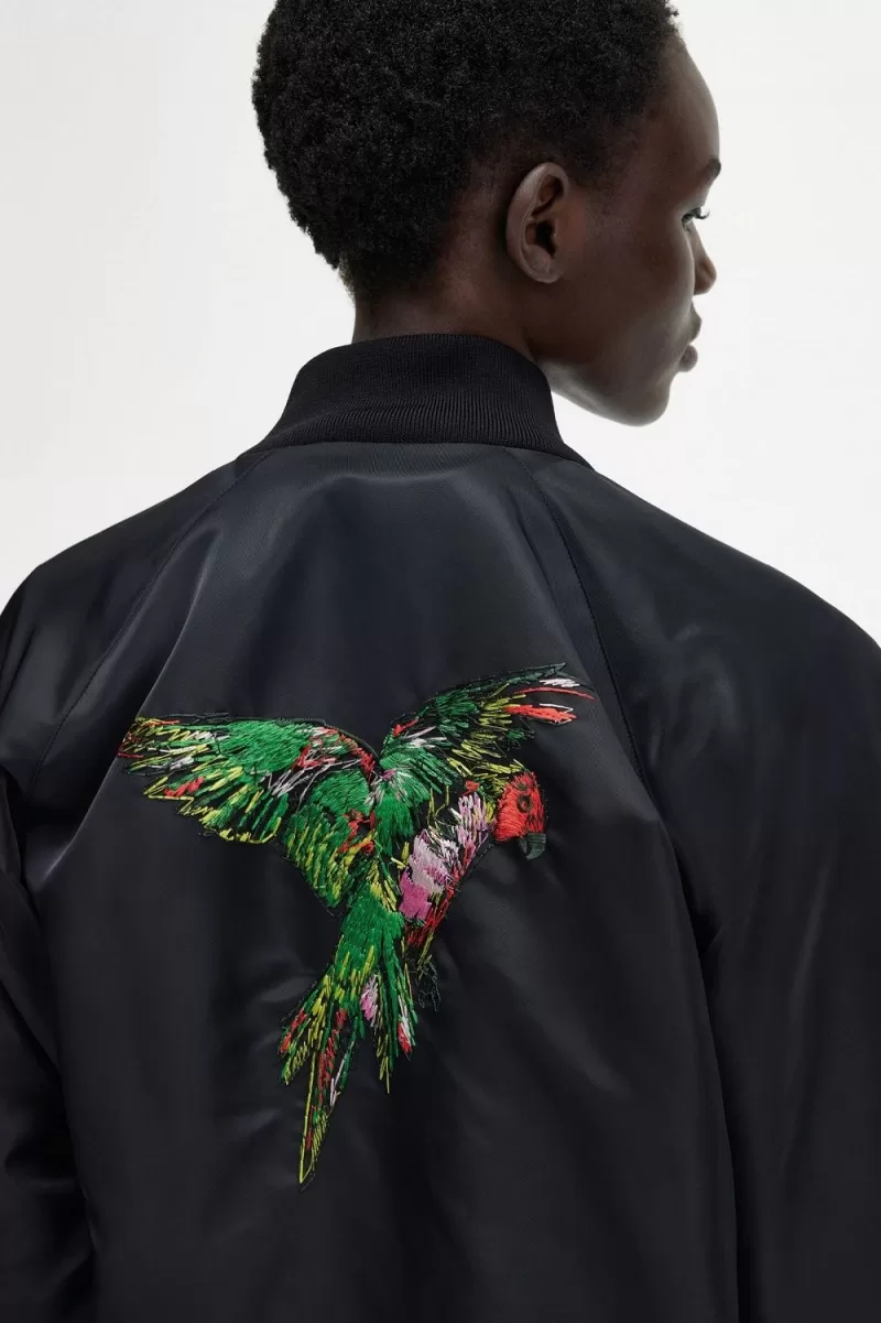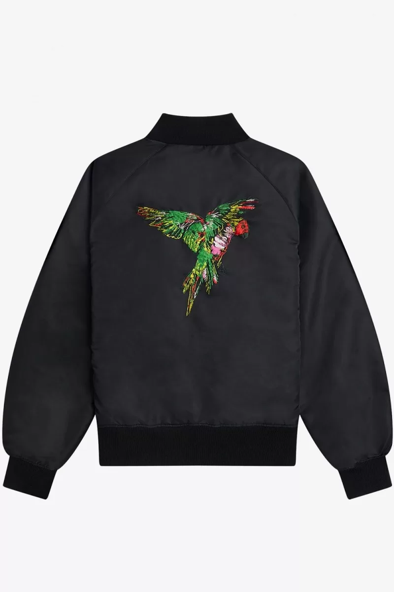 Partially recycled nylon / Relaxed fit / Padded body and sleeves / Tropical bird embroidery to back body / Rib neck, cuffs and hem