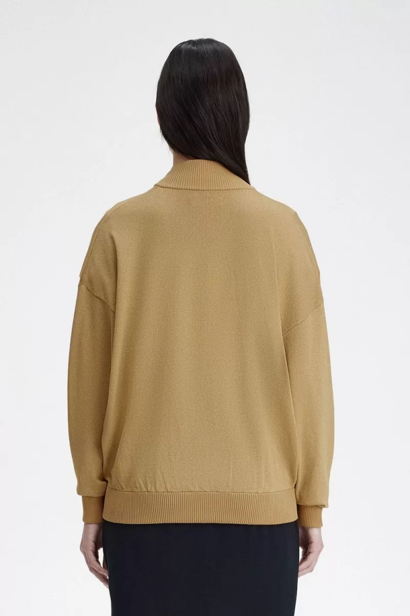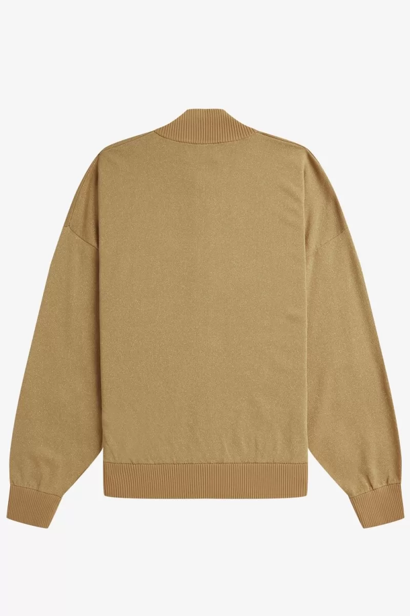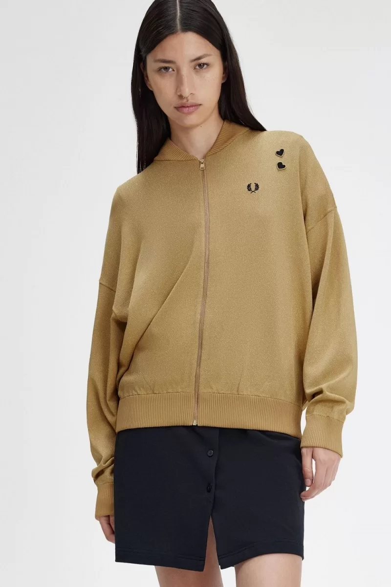 The tennis bomber is a sporting archetype that got recruited into subcultural fashion. Designed as part of our Amy collection, our knitted bomber gets a nightlife-inspired rework. A metallic gold finish ups the ante, referencing Amy’s high glamour days of the 2010s. Knitted in a recycled viscose blend, the relaxed drop-shoulder design is pure Amy. Signed off, as ever, with two embroidered hearts above the Laurel Wreath – a reference to the singer’s tattoos.20% of the net revenue received by Fred Perry for sales of its Amy Winehouse Foundation Collection goes to the Amy Winehouse Foundation (Reg. Charity no: 1143740). In 2022, the donation amounted to £499,695, and throughout the course of our partnership we’ve donated over £2 million. The Amy Winehouse Foundation is a registered charity in England and Wales set up in the memory of the late singer, working to inspire children and young people to build their self-esteem and resilience, so that they can flourish.