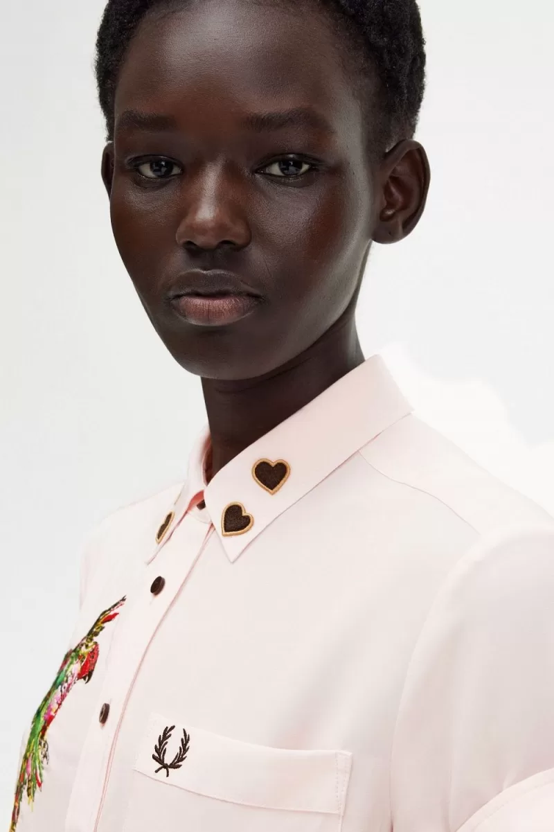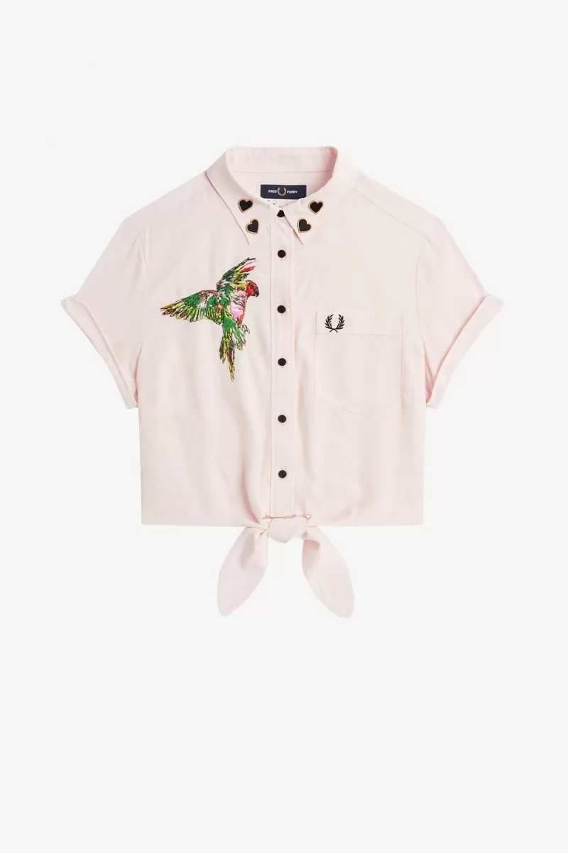 Viscose / Boxy fit with cropped length / Amy embroidered love heart patches above Laurel Wreath / Tropical bird embroidery / Front button opening with tie-front