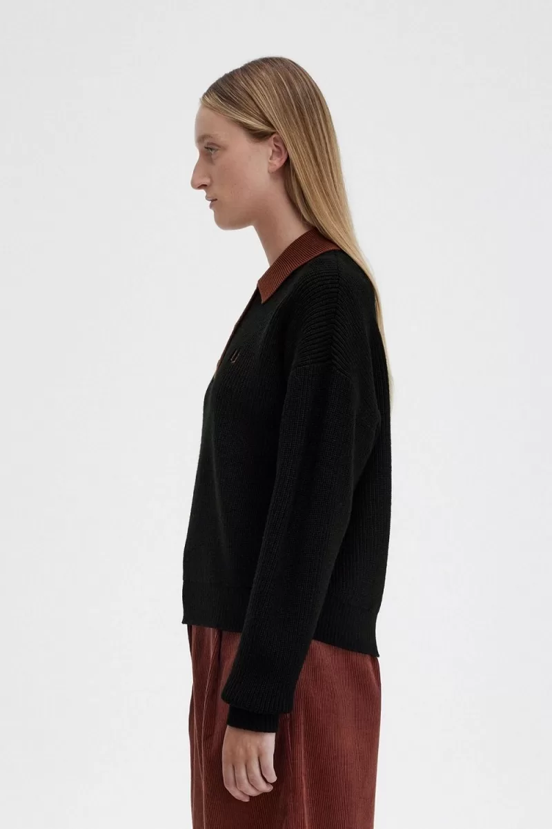 Wool, recycled acrylic, and recycled polyester blend knit / Oversized fit / Ribbed cuffs and hem / Contrast colour placket / Embroidered Laurel Wreath to the left chest