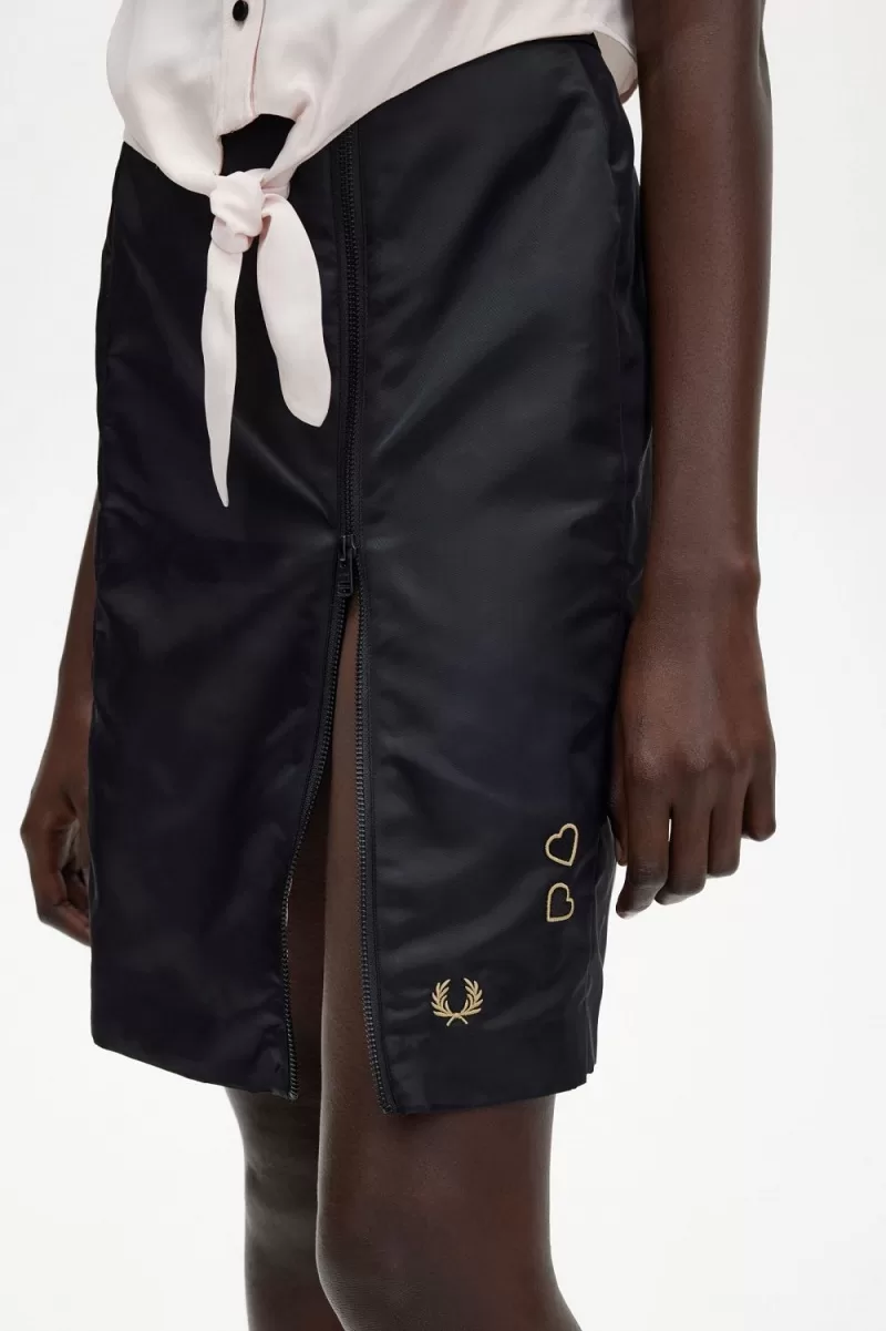 Whether she was at home on the streets of Camden, performing her music on world stages, or styling herself for photoshoots, Amy was synonymous with the Laurel Wreath. Our slim fit skirt is rooted in the singer’s distinctive styling and inspired by a style Amy often wore on stage. Our skirt is crafted from a partially recycled nylon and signed off with Amy’s signature love heart embroidery above the Laurel Wreath. We continue to collaborate with the Amy Winehouse Foundation, contributing to the charity with each collection, supporting their vital work for vulnerable young people.